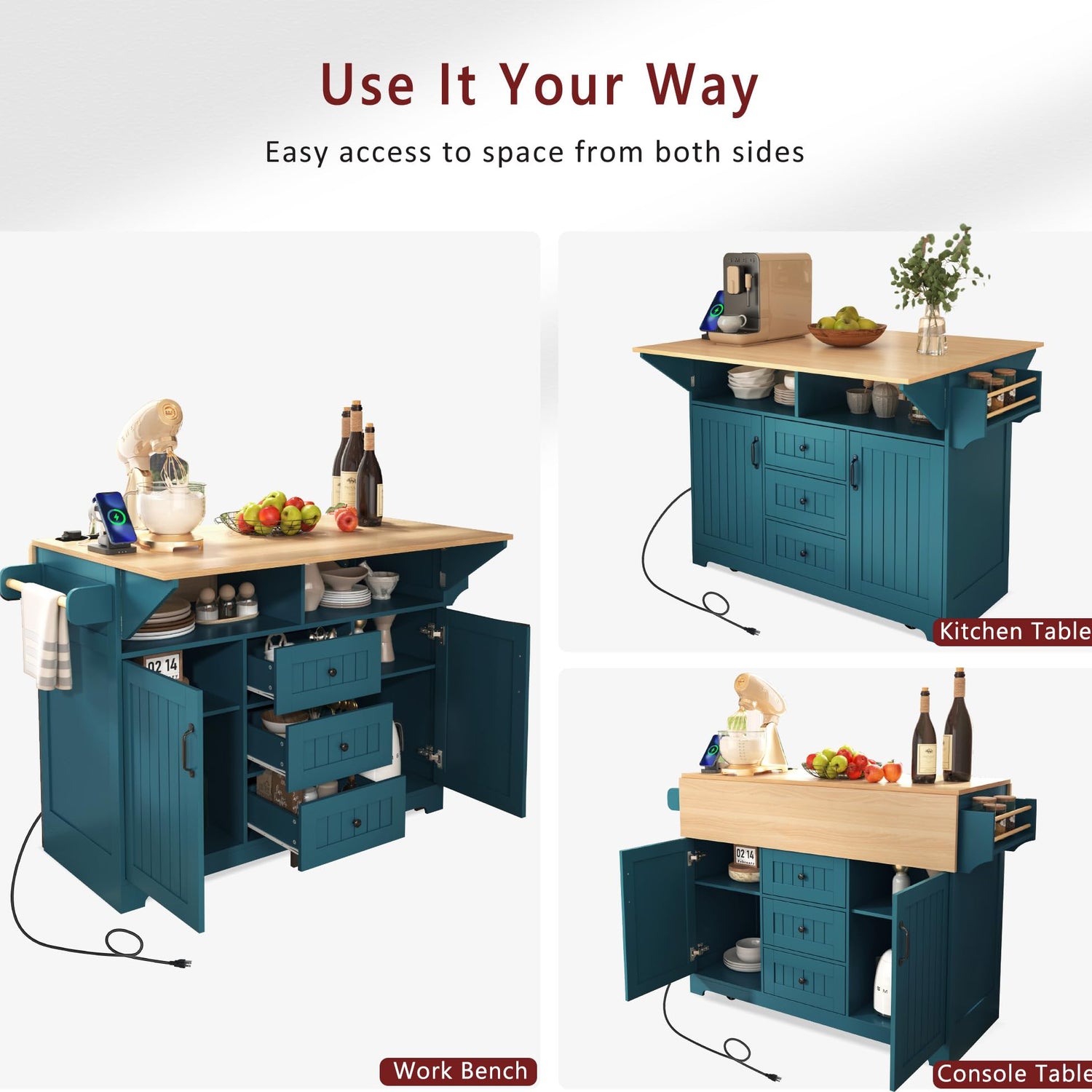 Quarte Farmhouse Large Kitchen Island with 2 Drop Leaf and Power Outlet,Rolling Kitchen Cart on 5 Wheels, Folding Storage Dining Table for Home, Dining Room (Green/Double)
