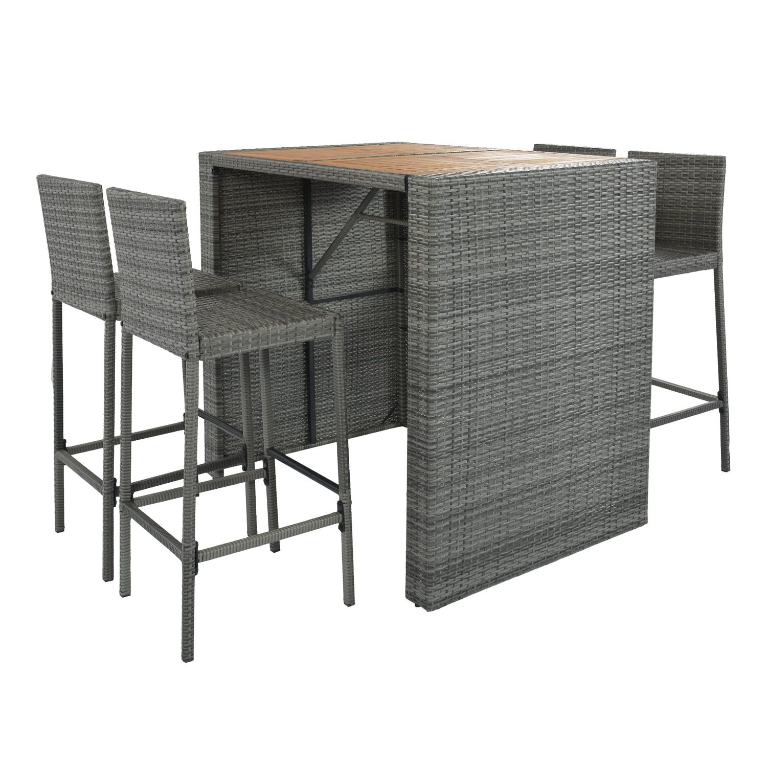 Quarte Modern 5-Piece Outdoor Patio Dining Set, Garden PE Rattan Wicker Bar Set, 4 Bar Height Chairs with Non-Slip Feet and Fixed Rope, Acacia Wood Table Top