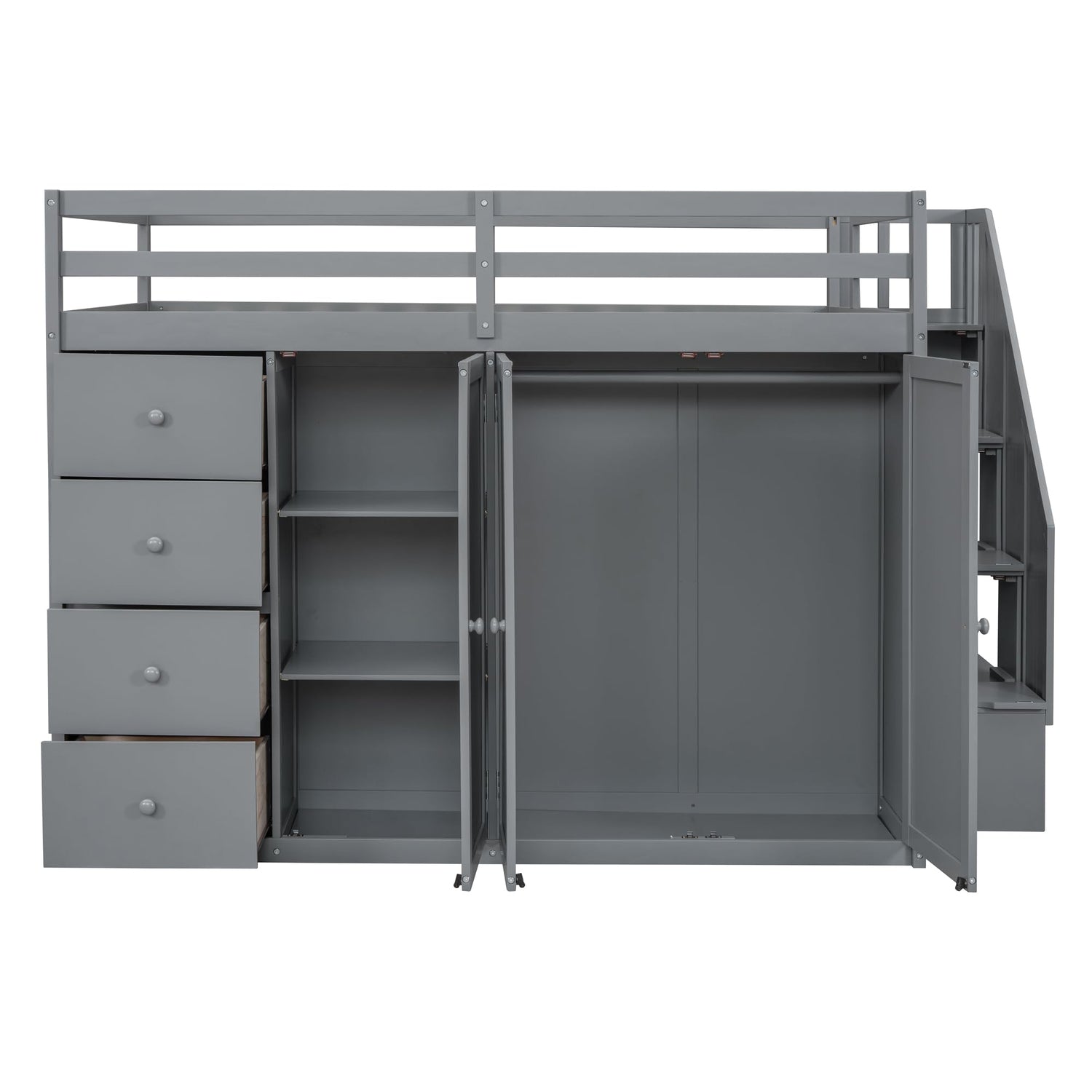 Quarte Multifunctional Loft Bed, Full Size Loft Bed with Built-in Wardrobes, Cabinets and Drawers for Kids Teens Adults, No Box Spring Required (Gray/Pine3, Full)