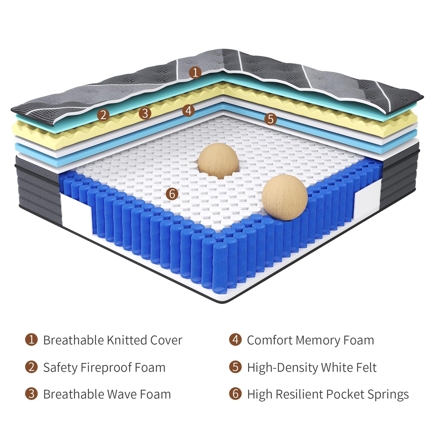 - COMFORTABLE SUPPORT AND SWEET SLEEP:The Queen mattress combines individually wrapped pocket springs with premium memory foam to evenly distribute your weight from head to toe. This design relieves pressure points, reduces body fatigue, and alleviates aches and pains, ensuring a deeper, more restful sleep and significantly improving your overall sleep quality.