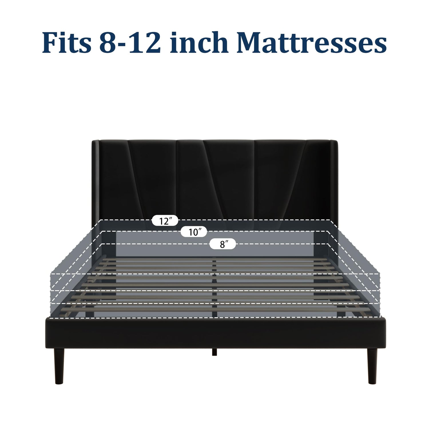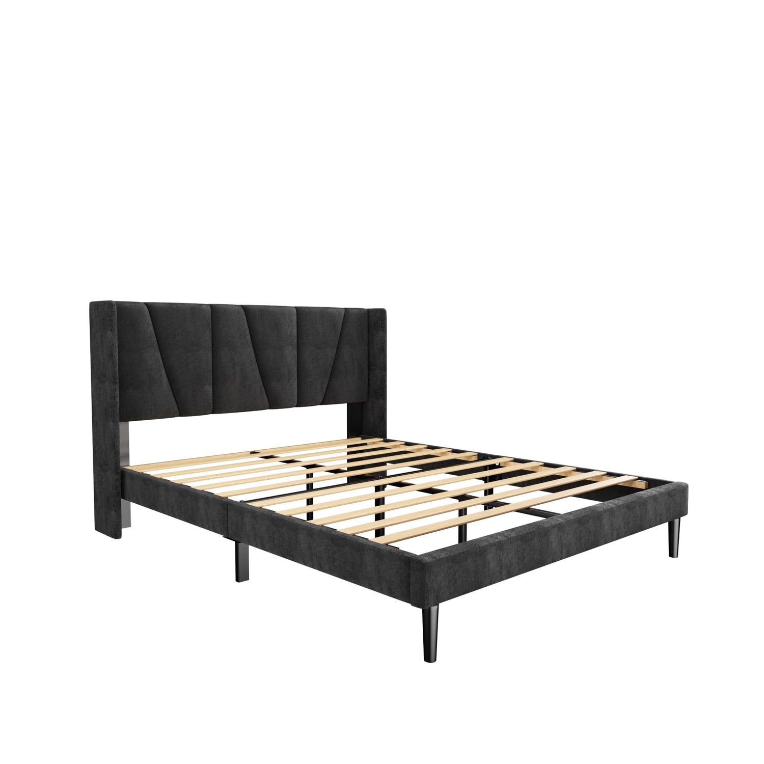 - MODERN WINGBACK HEADBOARD: This queen size bed frame comes with an upholstered headboard and wingboard, velvet fabric wrapped in soft foam, which not only provides you with a cozy touch, but also adds a sophisticated and elegant visual feeling to the entire bedroom.(Recommended with 8-12" mattresses)