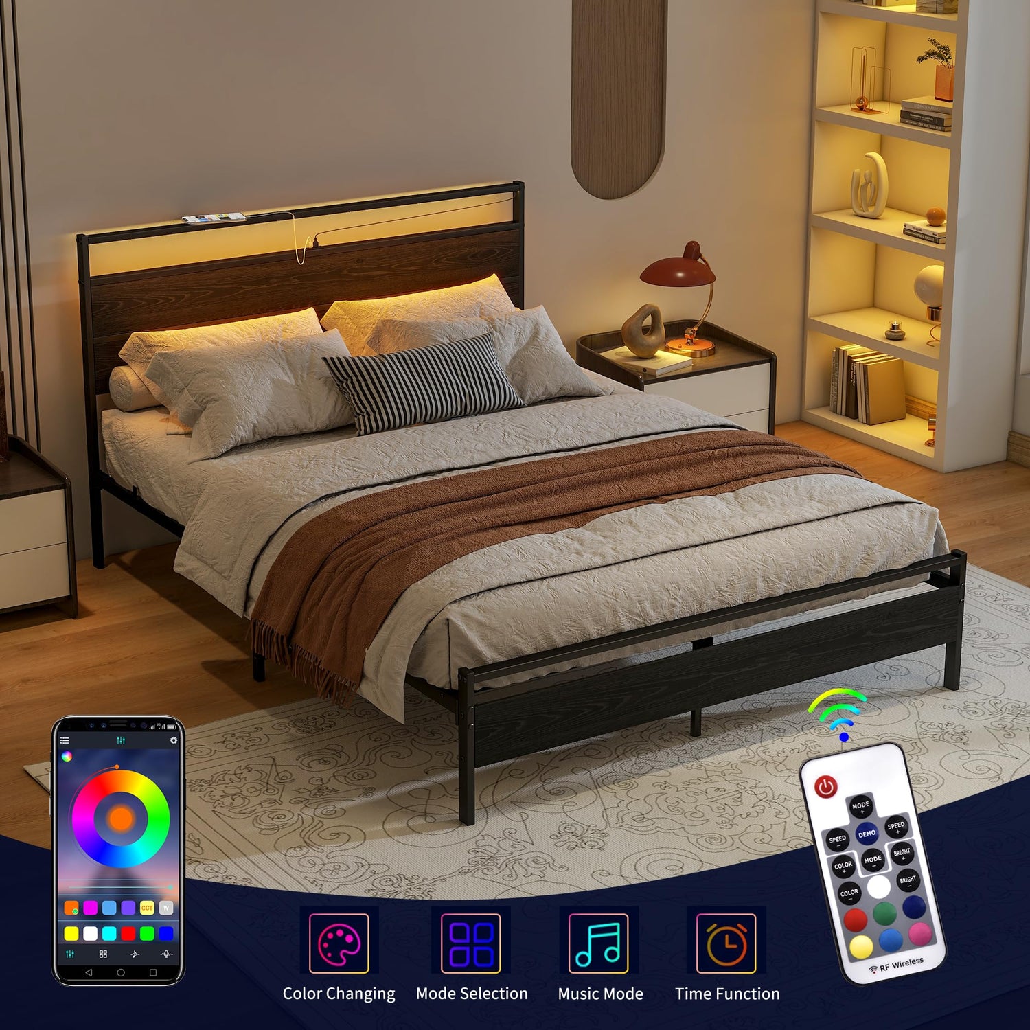 Transform your bedroom into a stylish sanctuary with the HOJINLINERO Queen Bed Frame featuring a beautiful wood headboard, dynamic LED lighting, and a convenient charging station. This heavy-duty metal platform bed is designed to offer both elegance and functionality, ensuring a restful retreat.