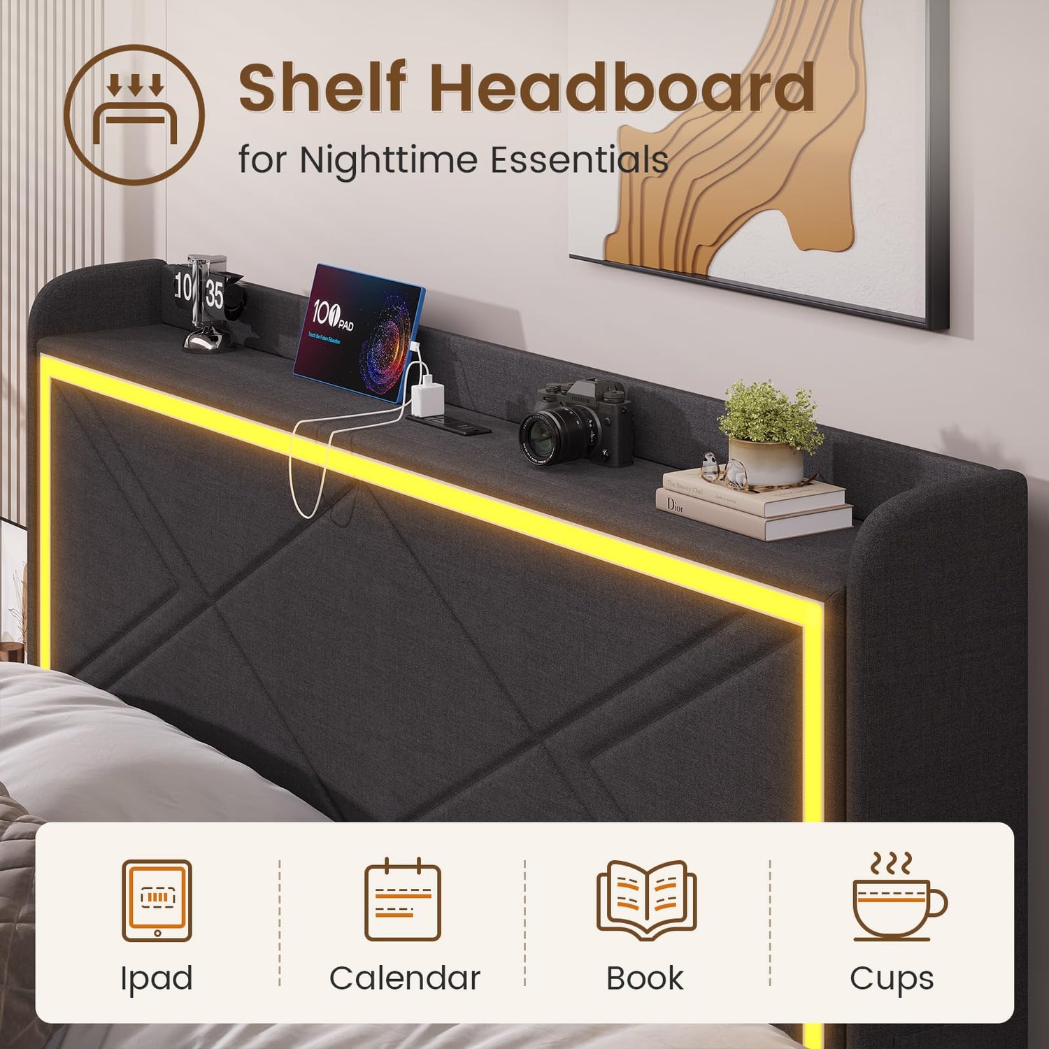 BTHFST Modern Queen Bed Frame with RGB LED Headboard, USB Charging & Storage Drawers in Dark Gray