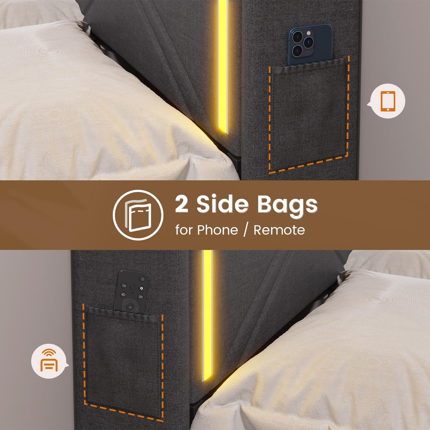 Additionally, the thoughtful design includes two side bags on the headboard, perfect for storing your remote and phone, facilitating convenience and accessibility.