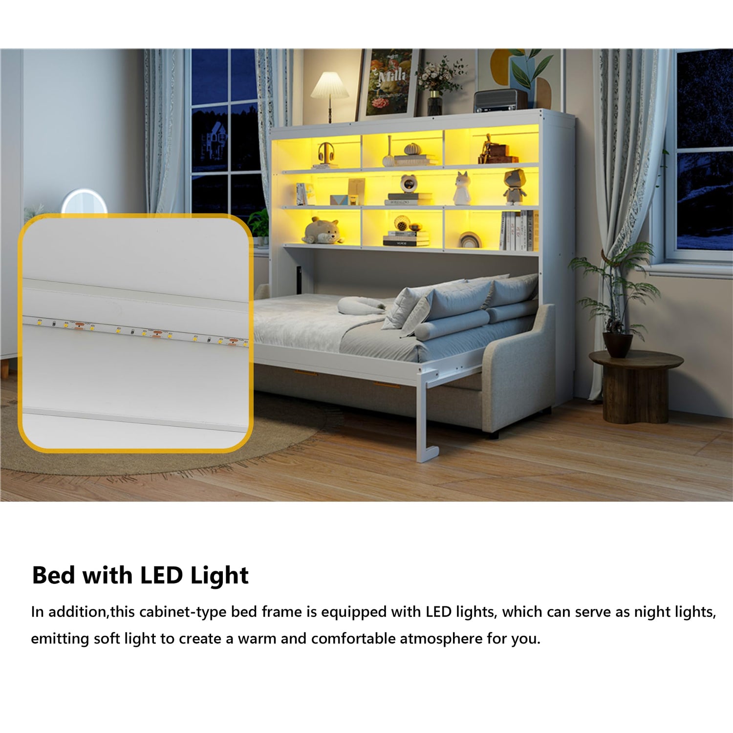 Queen Horizontal Murphy Bed with Sofa and Storage Shelves,LED Light,Solid Wood Space Saving Hideaway Murphy Wall Bed with Couch and Storage for Adults (Beige)