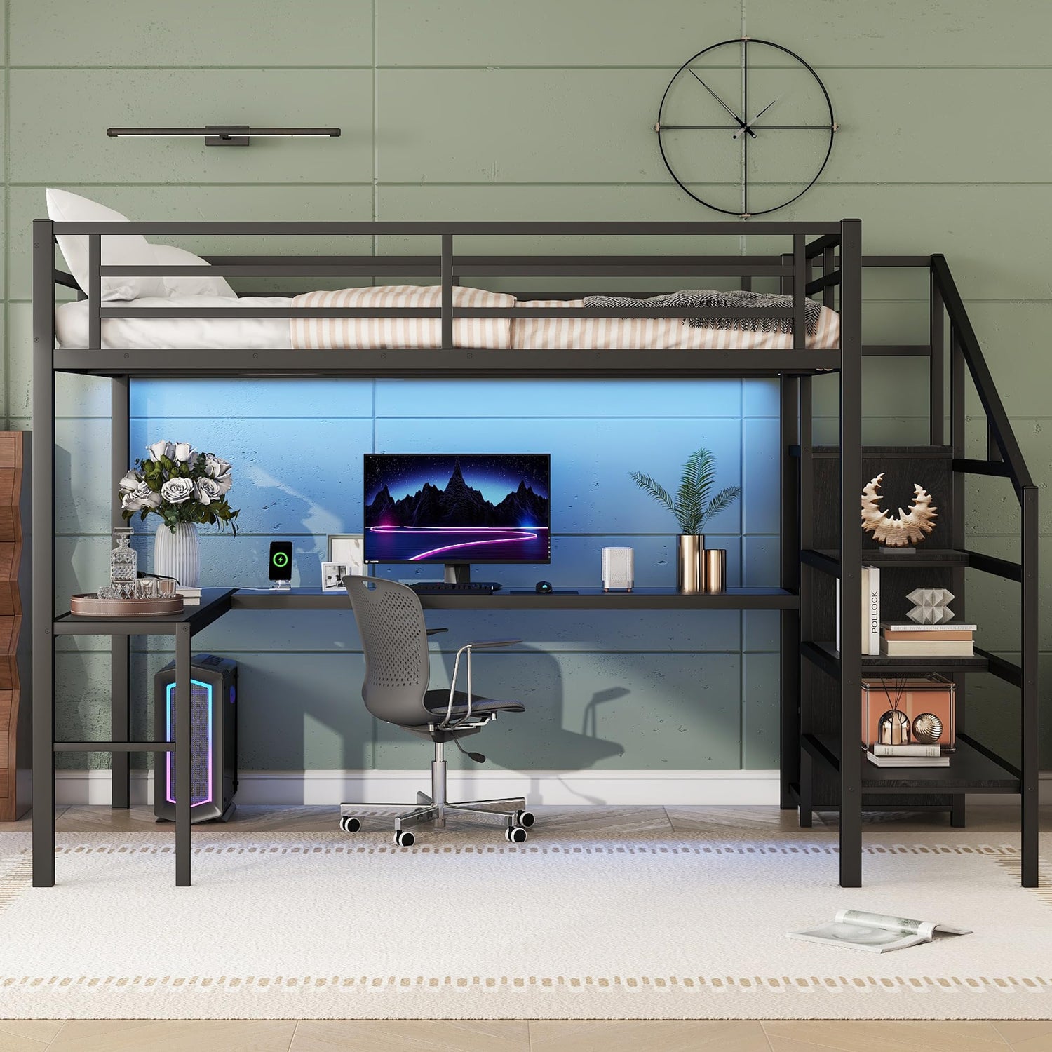 Queen Loft Bed with Stairs and Wardrobe, Queen Size Loft Bed with Desk and Storage, Metal Loft Bed with Charging Station and Light, Queen Size Loft Bed for Adults, Teens, Kids(Balck Queen)