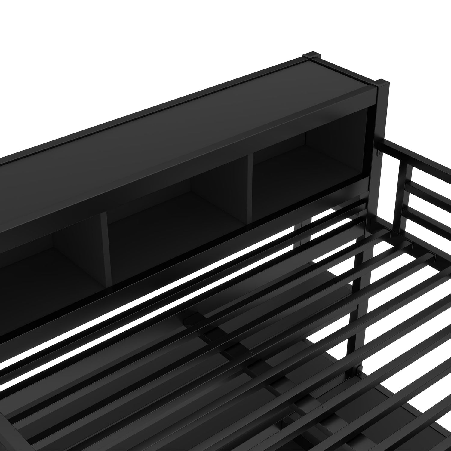 Queen Loft Bed with Wardrobe and Storage Cubes, Queen Size Loft Bed with Desk and Storage Shelf, Metal Loft Bed with Guardrail, Queen Size Loft Bed for Adults, Teens, Kids(Black Queen)