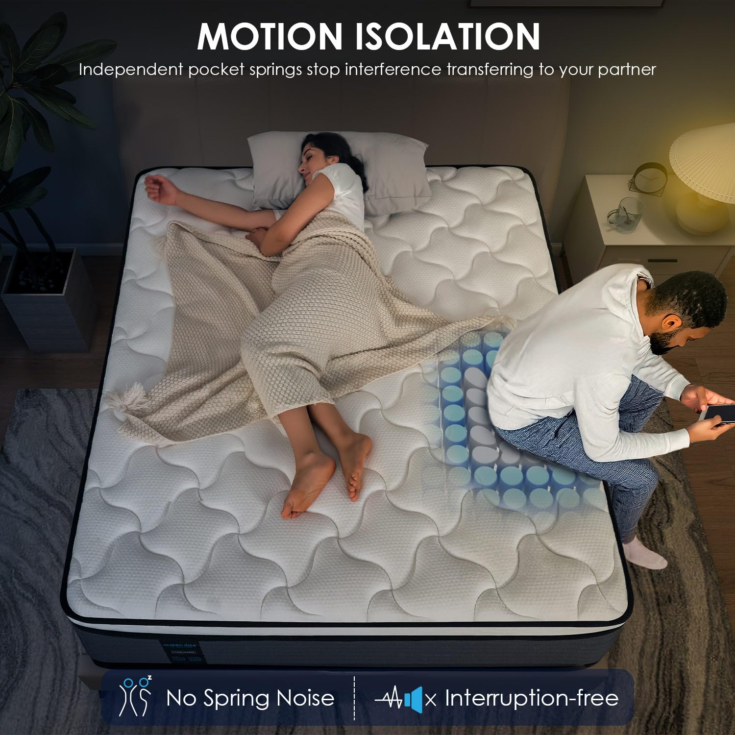 - 【Undisturbed Night for Sound Sleep】The hybrid mattress queen size boasts hundreds of individual springs. 5-zone ergonomic support system, gives you superior support that targets the head, shoulders, lumbar, hips and legs, corrects sleeping positions and improves spinal health, no more roused by a stiff neck and numb arms. Pocket design reduces friction noise of springs, so enjoy an uninterrupted and steady sleep with your partner or pet