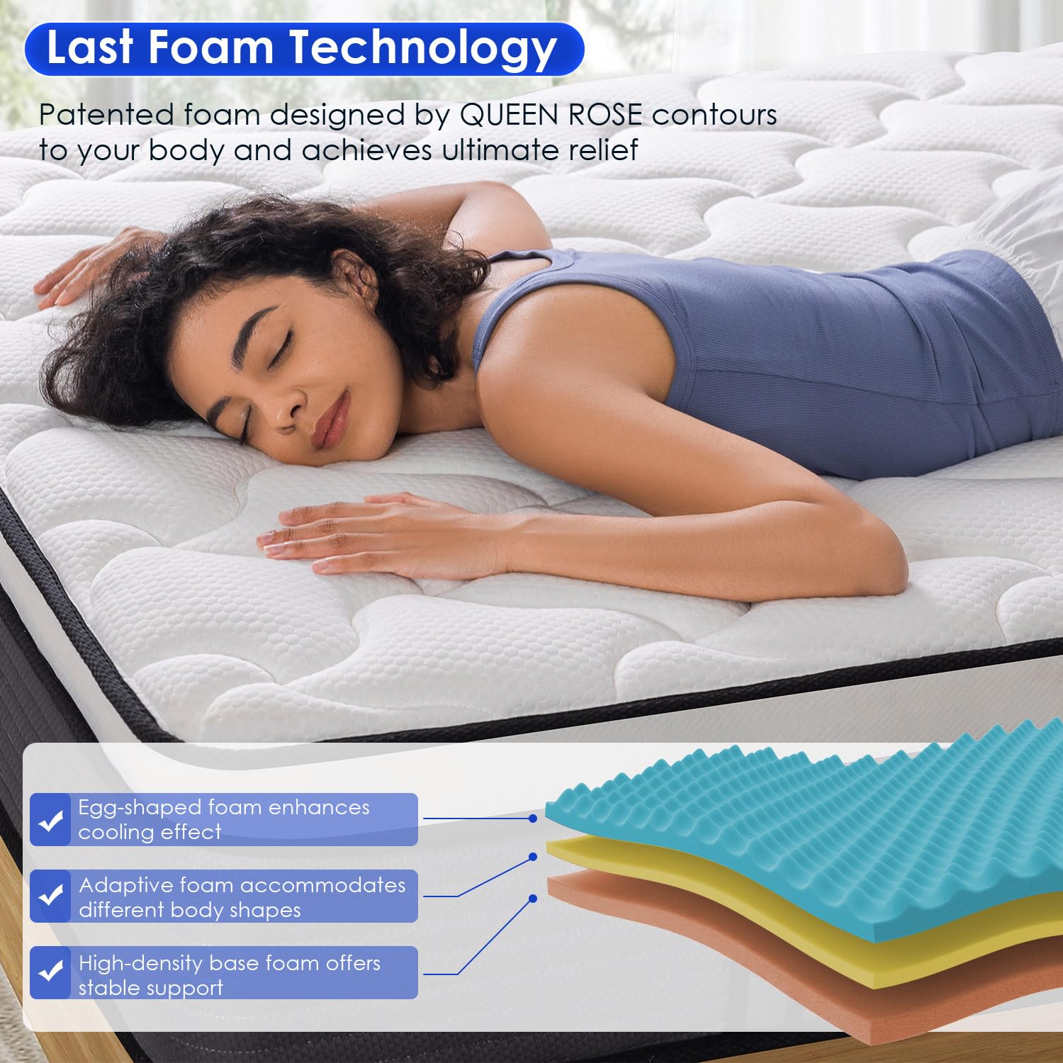 QUEEN ROSE King Mattress, 10 Inch King Size Hybrid Mattress in a Box, Gel Memory Foam & Individually Pocket Innerspring Hybrid Bed, Medium Firm, Fiberglass Free & CertiPUR-US Certified