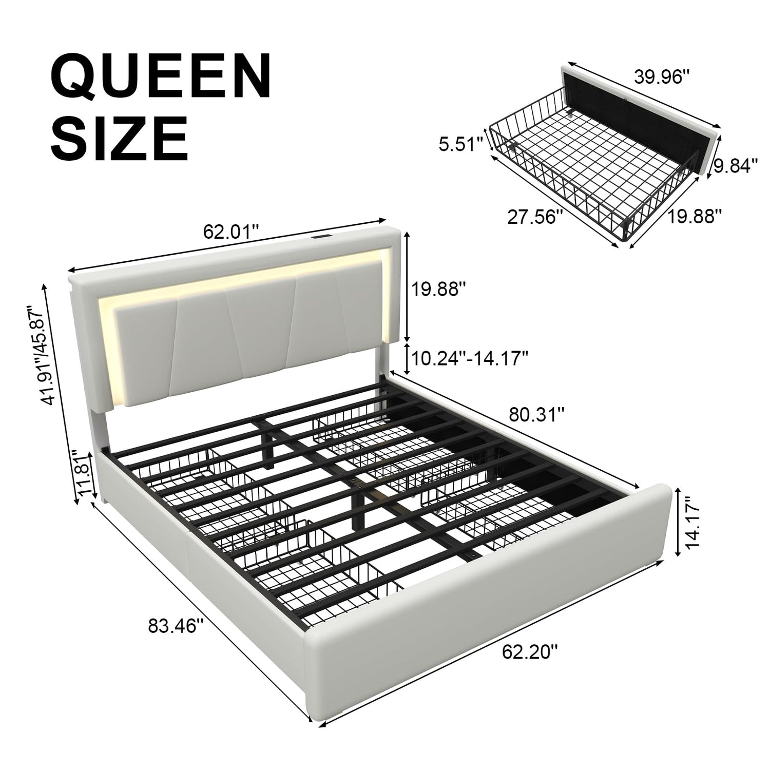 Queen Size Bed Frame with 4 Storage Drawers and LED Lights, Upholstered Platform Bed with Adjustable Headboard and Charging Station, Metal Slats Support, No Box Spring Needed,Easy Assembly, White