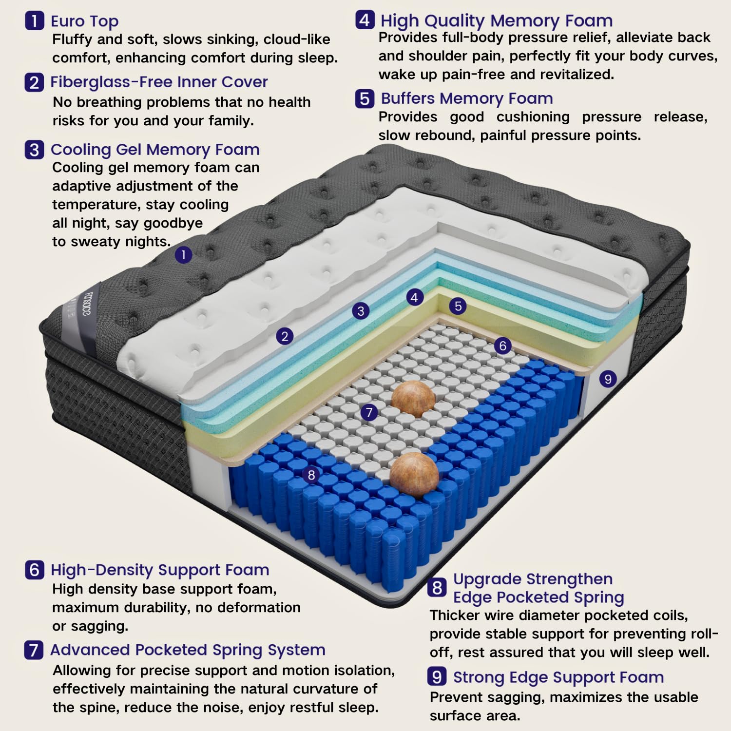 - 5 Layers of Premium Foam - 16 Inch queen mattress is infused with a gel memory foam that aligns your spine, evenly distributes your weight, relaxes your muscles 360° and relieves stress, suitable for all sleeping positions, providing the ultimate comfort for your sleep.