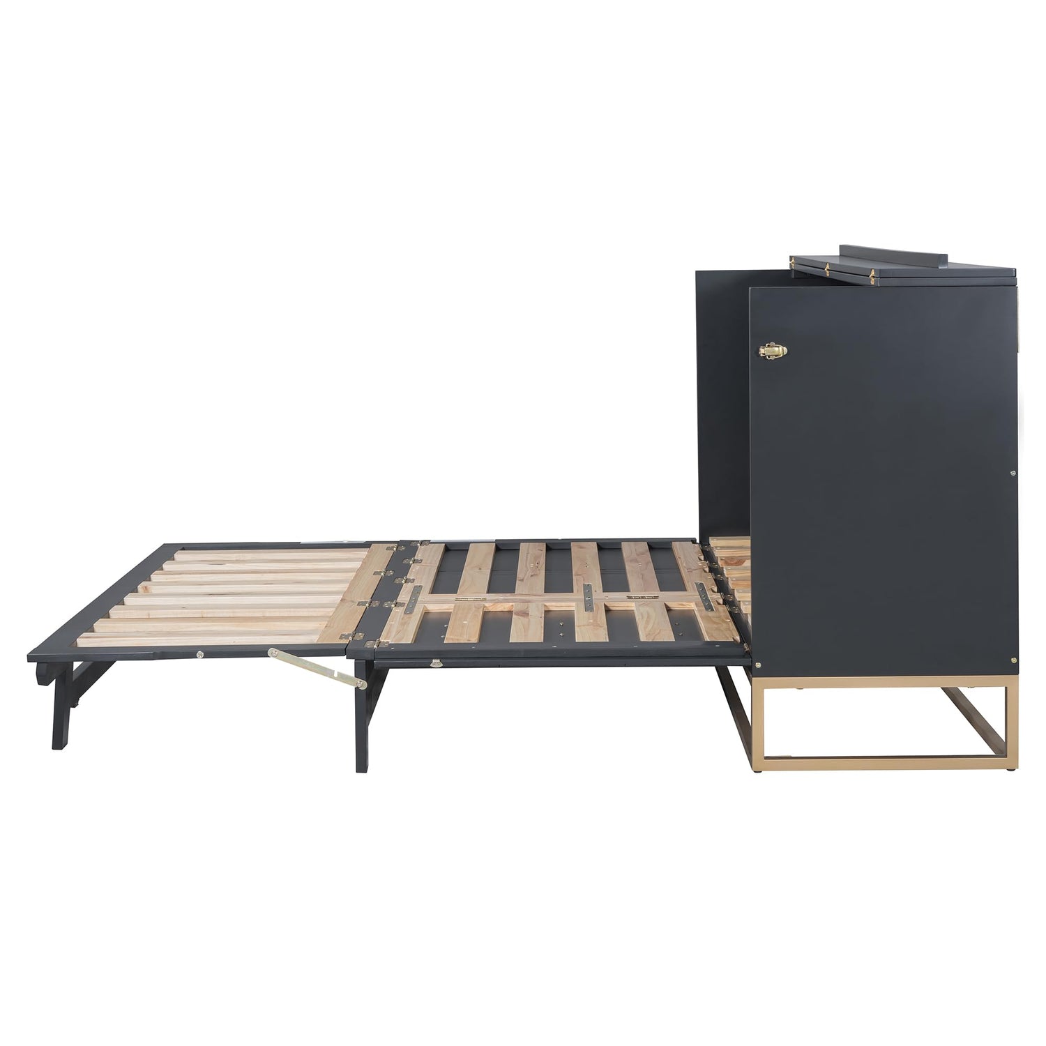 - 【Exquisite Details】This Murphy bed features a sleek and sophisticated design, with vertical striped frosted glass on the left and a faux three-drawer look on the right,Equipped with gold metal handles and legs, adding a touch of elegance and durability, while enhancing the overall aesthetic with a metallic finish.