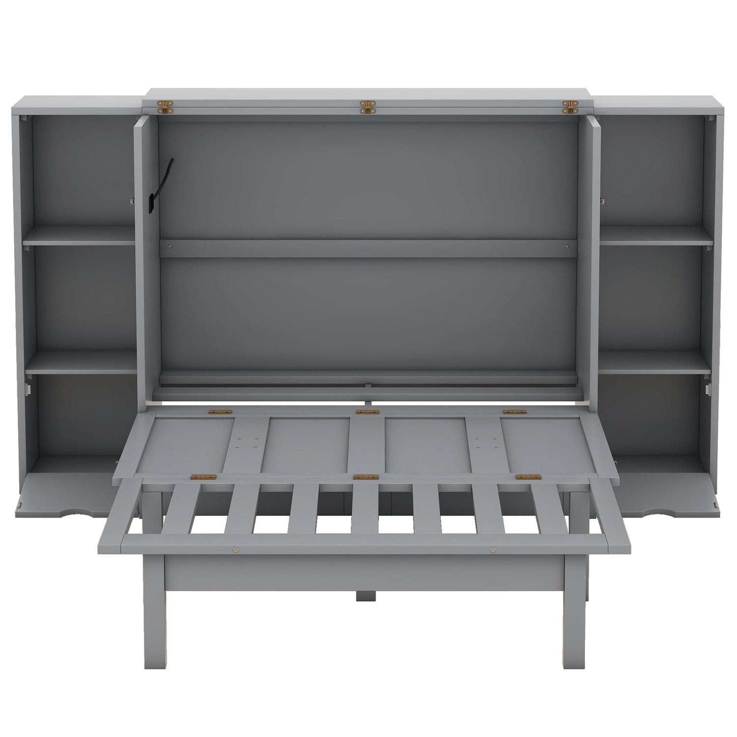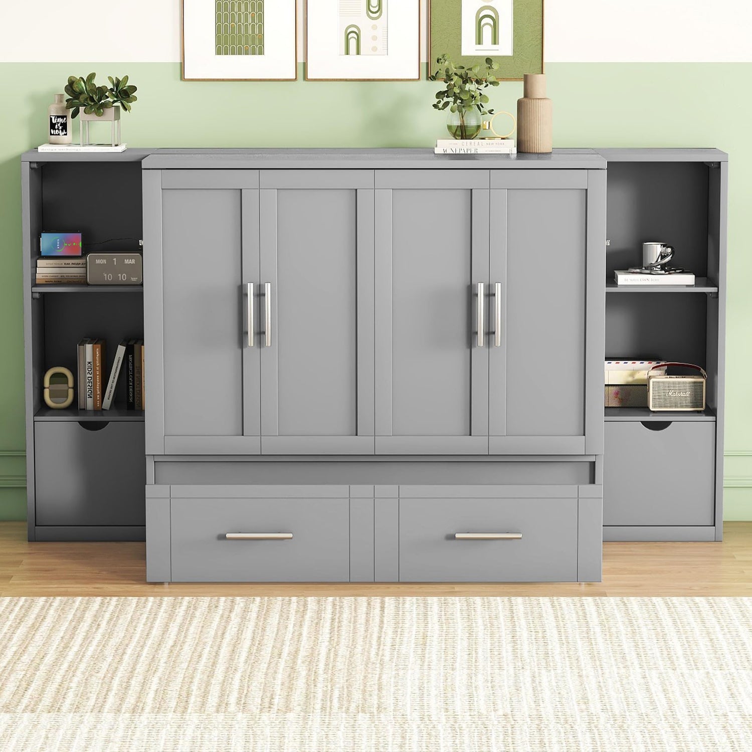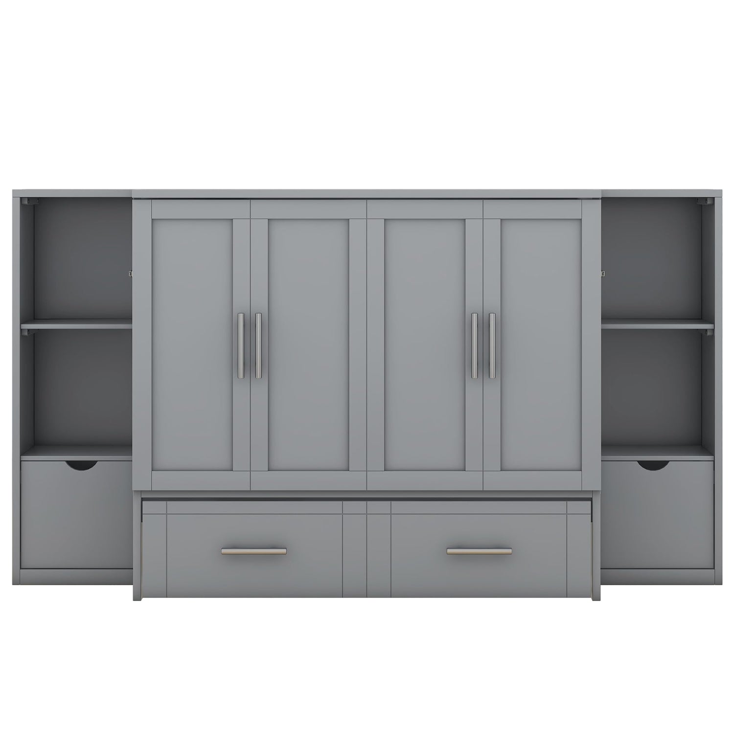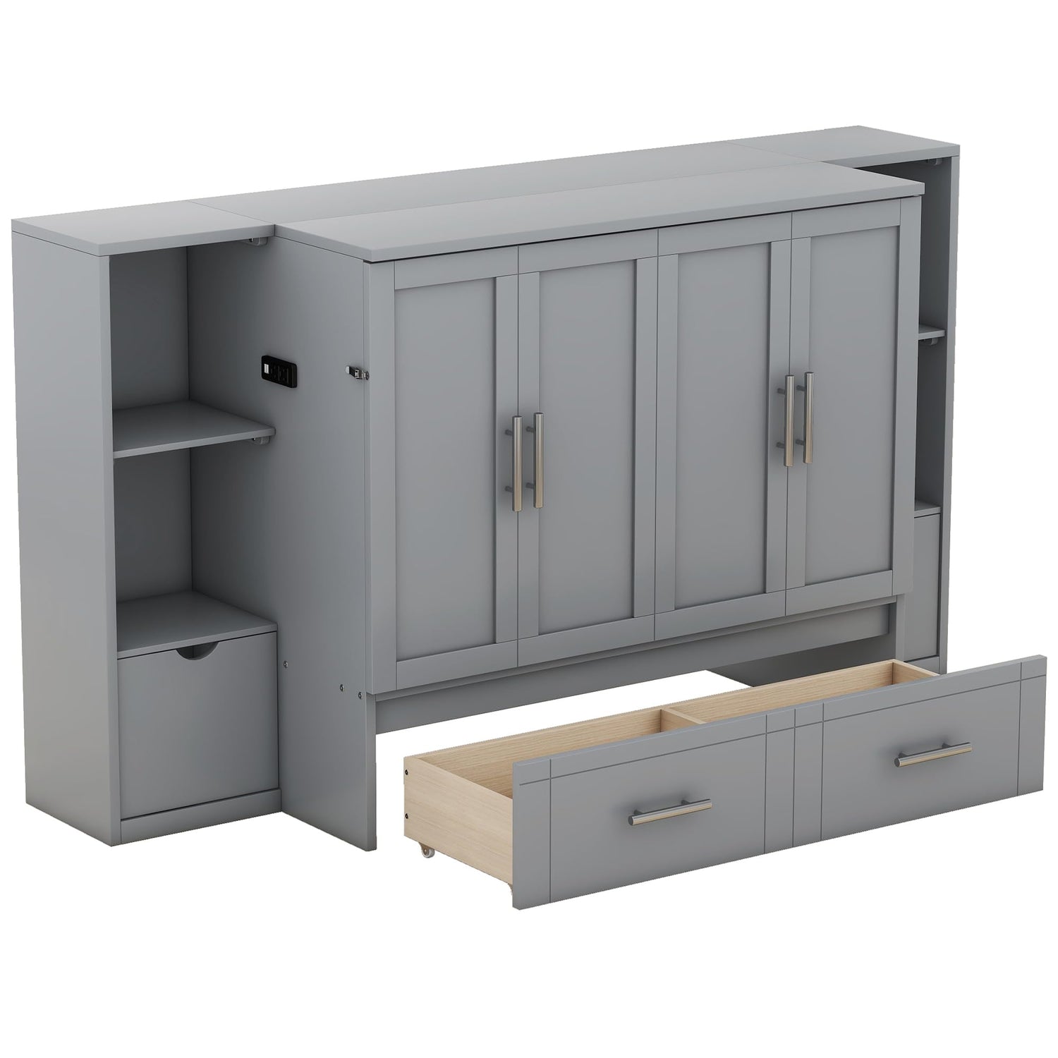 Queen Size Murphy Wall Bed With Storage and Bookcase Headboard, Solid Wood Cabinets, Shelves, Drawers and USB Ports - Multi-Function Platform for Home Office, Guest Room - Gray
