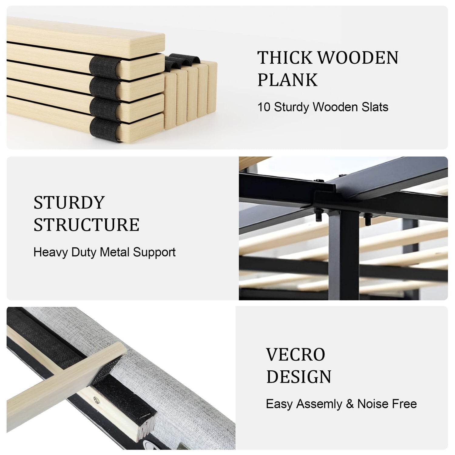 - Solid & Stable Build - The combination of a robust steel frame and reinforced wooden slats creates an ultra-stable queen size bed platform. Works perfectly with 6-12 inch mattresses - no box spring necessary