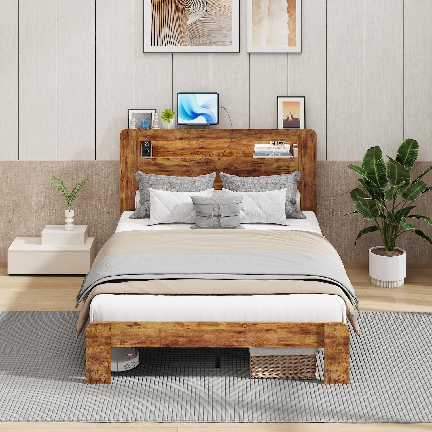 - 【Convenient Charging Headboard】 The rustic wooden bed frame with storage bookshelf headboard with Led Lights features a built-in headboard with 2 AC outlets, 2 USB ports, and 1 Type-C port, powered by a 6-foot extended cord. Keep phones, tablets, and lamps charged effortlessly—no more tangled wires or reaching for distant sockets.