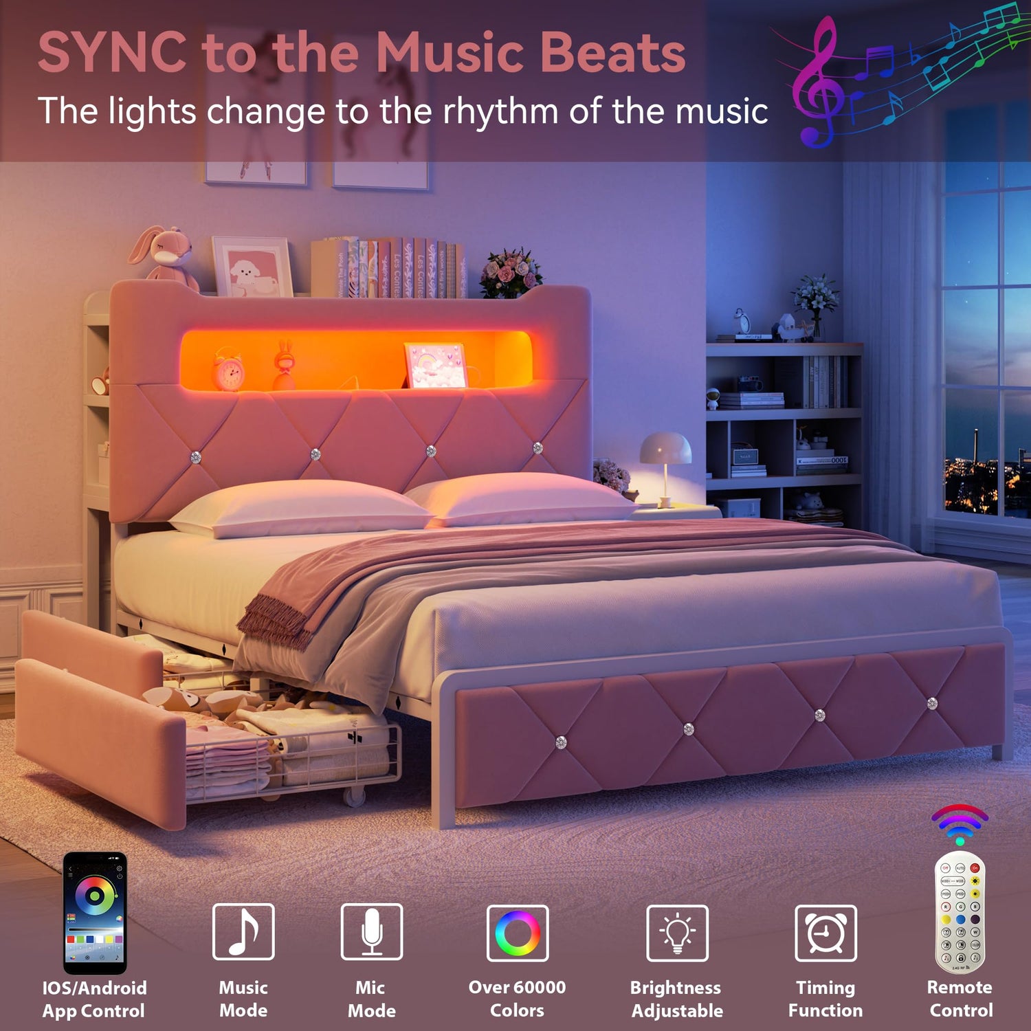 - SMART RGB LIGHTS WITH MUSIC SYNC: This queen bed frame with built-in RGB LED headboard transforms your bedroom with over 16 million colors, 20+ light effects, and dynamic modes controlled by app or remote. Bold lights sync with music, setting the ideal vibe for relaxing, reading, or entertaining. From gentle nightlight for kids to vivid party colors, this velvet bed frame makes every moment magical with immersive ambiance