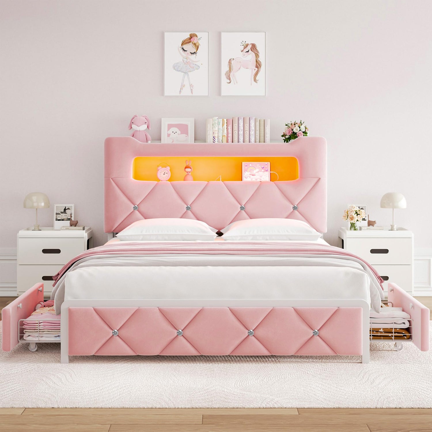 Queen Upholstered LED Bed Frame with 2 Storage Drawers and 2-Tier Storage Headboard,Velvet Princess Platform Bed with Charging Station & Bookcase, Corner Bed Frame, Heavy Duty Metal Support, Pink