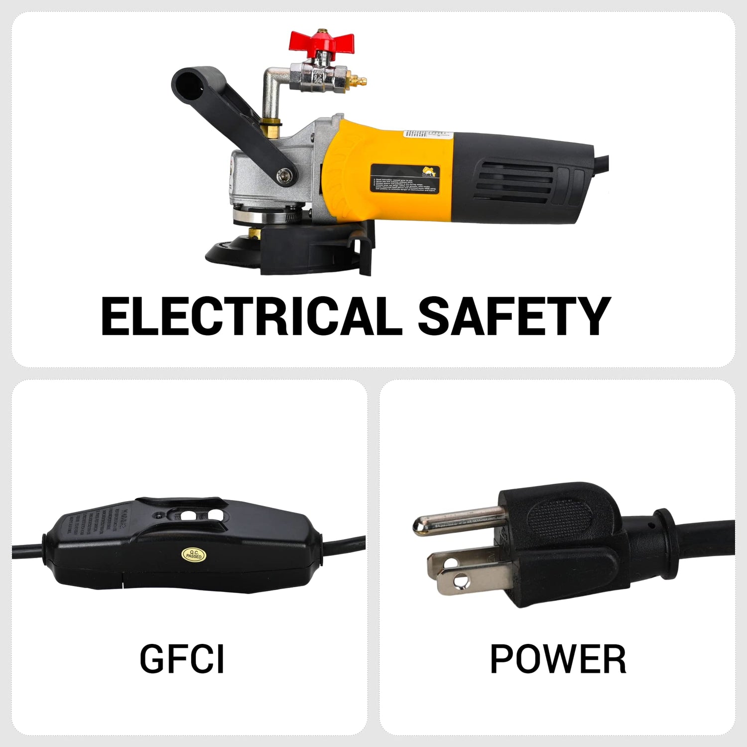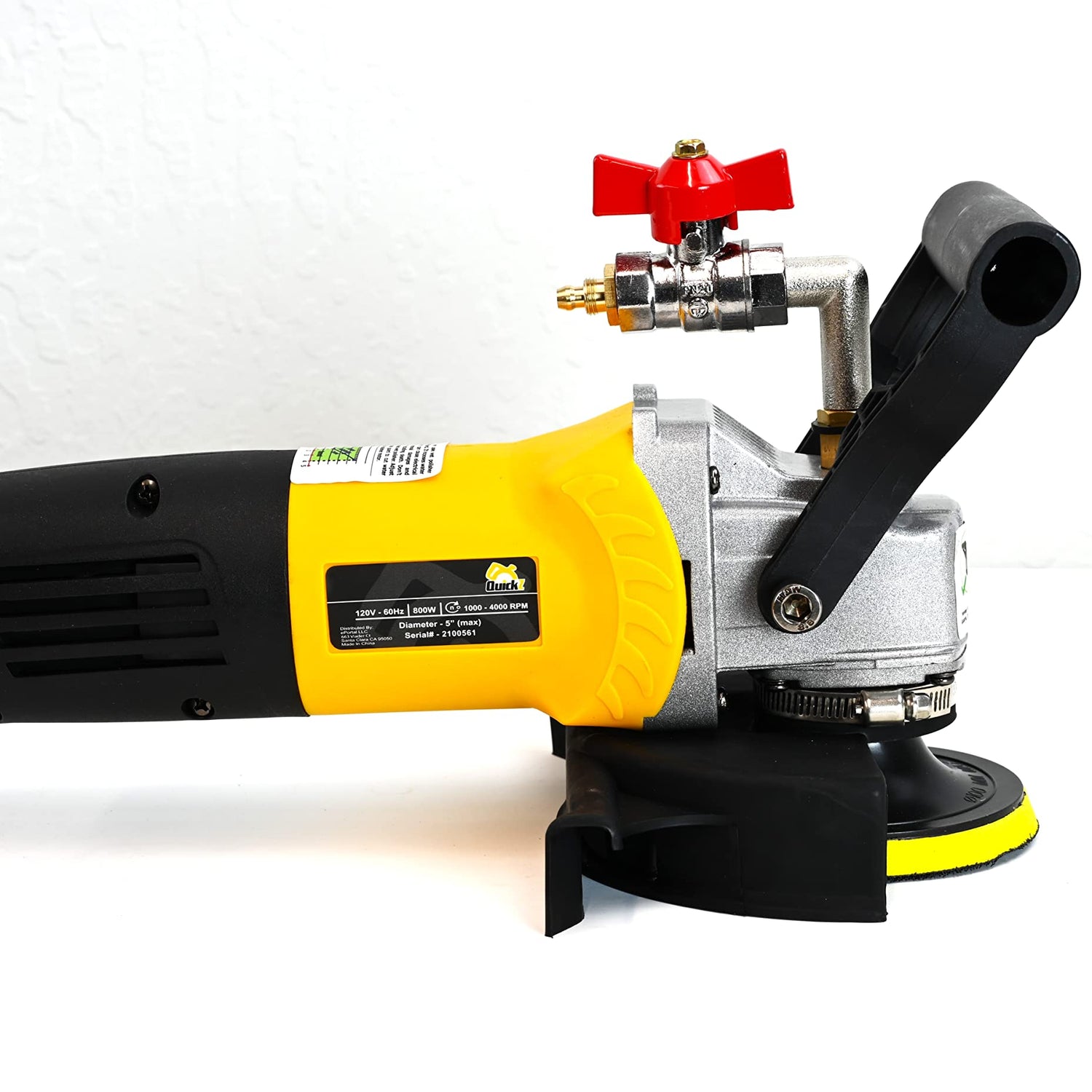 - SEAMLESS GARDEN HOSE CONNECTION & EASE OF USE - In-built water quick-connect to garden hose, Water pressure control, Water Stopper, Extra-long water line, adjustable granite concrete wet polisher water flow line for easy use, three-hole 120 degree water hole for even water distribution, no dry spot for concrete polishing pads or granite polishing pads. Soft-start for jerk free start of wet stone grinder/concrete polisher, splash guard for water control, Top D-handle must for stone polishing