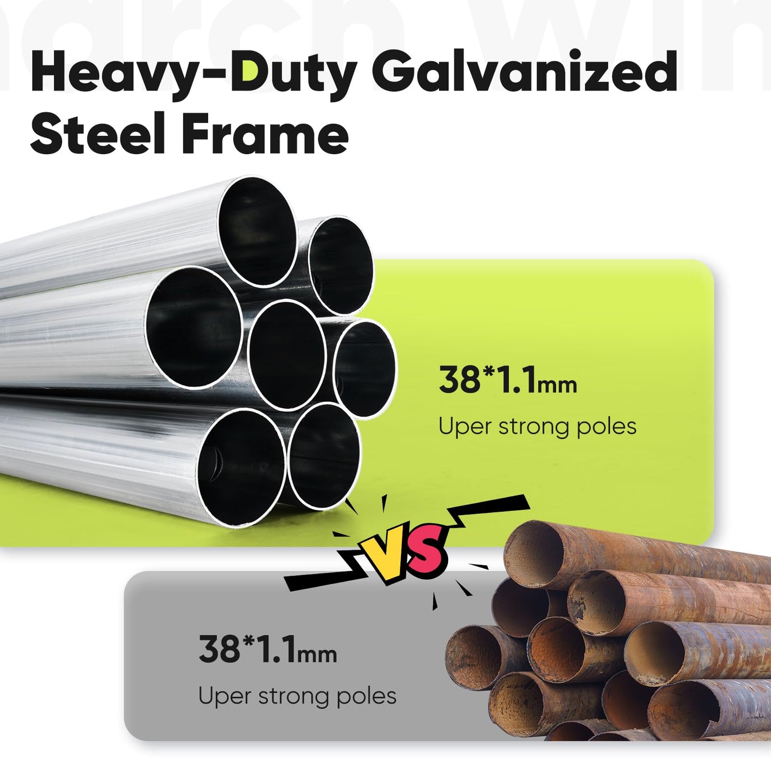 - 【Heavy Duty Structure】Our canopy features a upgrade durable iron metal frame with 1.5-inch diameter poles and a thickness of 1.2 mm, ensuring outstanding stability and wind resistance.Tips: the ground nails are essential to improving stability on grassy surfaces, while expansion screws do the same for cement surfaces; Take preventative measures to avoid wind when wind speed reaches 25 mph or higher.