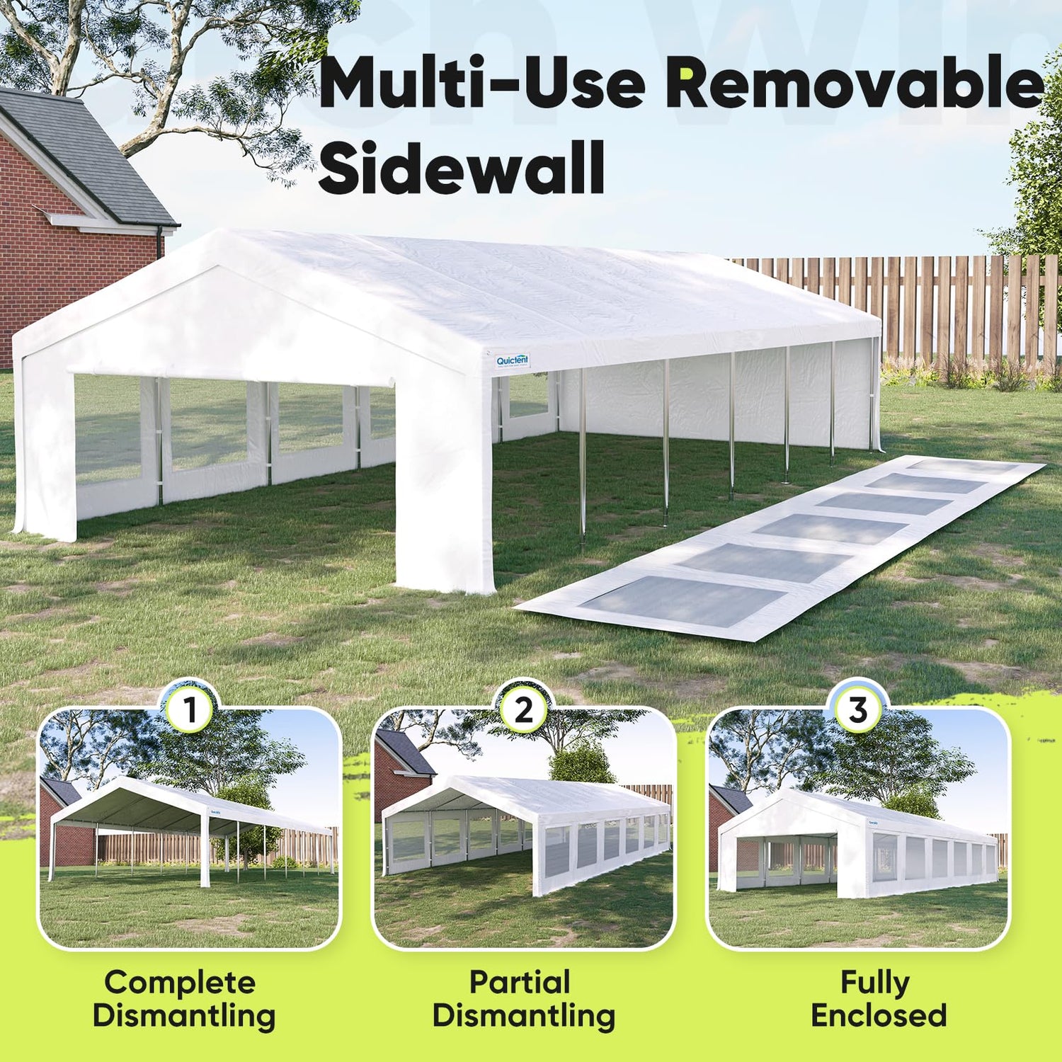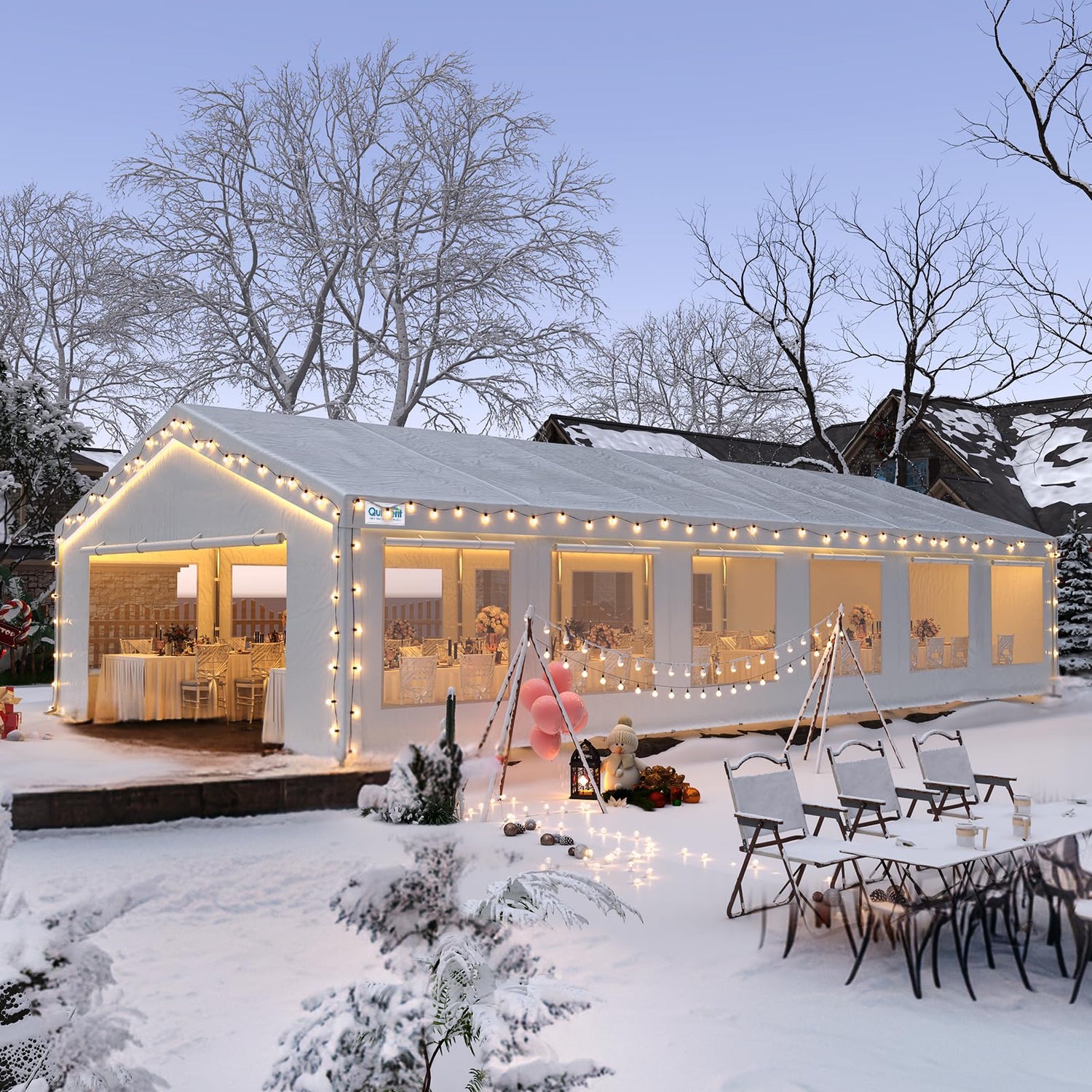- 【Premium Material】Top cover of our white tent is made of 160g imported PE fabric, providing waterproof and UV protection.Our 20x40 Heavy Duty Canopy Tent is designed with 2 removable sidewalls and 2 zippered doors with chapel-designed windows that provide excellent cross ventilation and airflow, ensuring you have a cool and comfortable experience.The whole piece of sidewall is also convenient for you to disassemble and install at any time.
