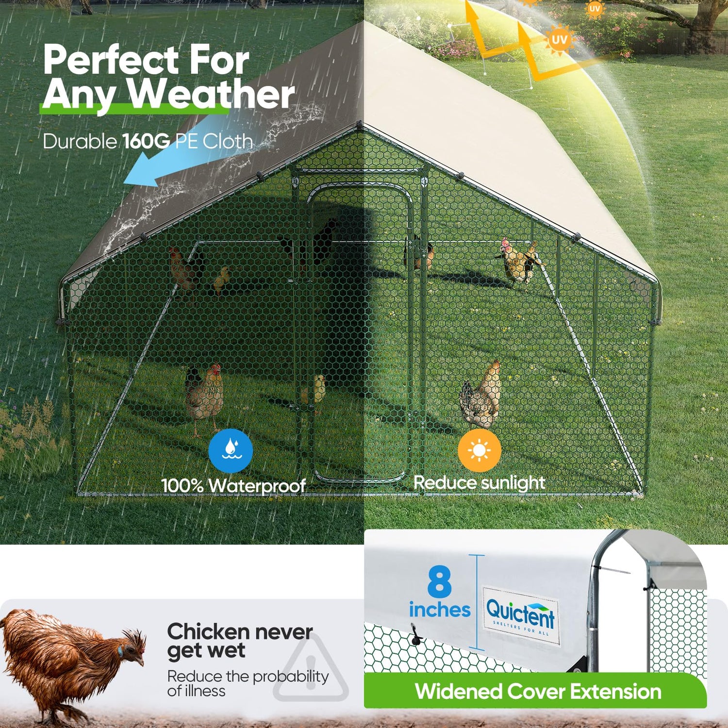 - Stable Rust-Resistant Supporting Frame: Constructed with 1" diameter galvanized rust-free poles, Quictent chicken run's peak roof design prevents the water or snow accumulation. The sturdy narrow latch and door gap effectively keeps predators out and keeps chickens in.