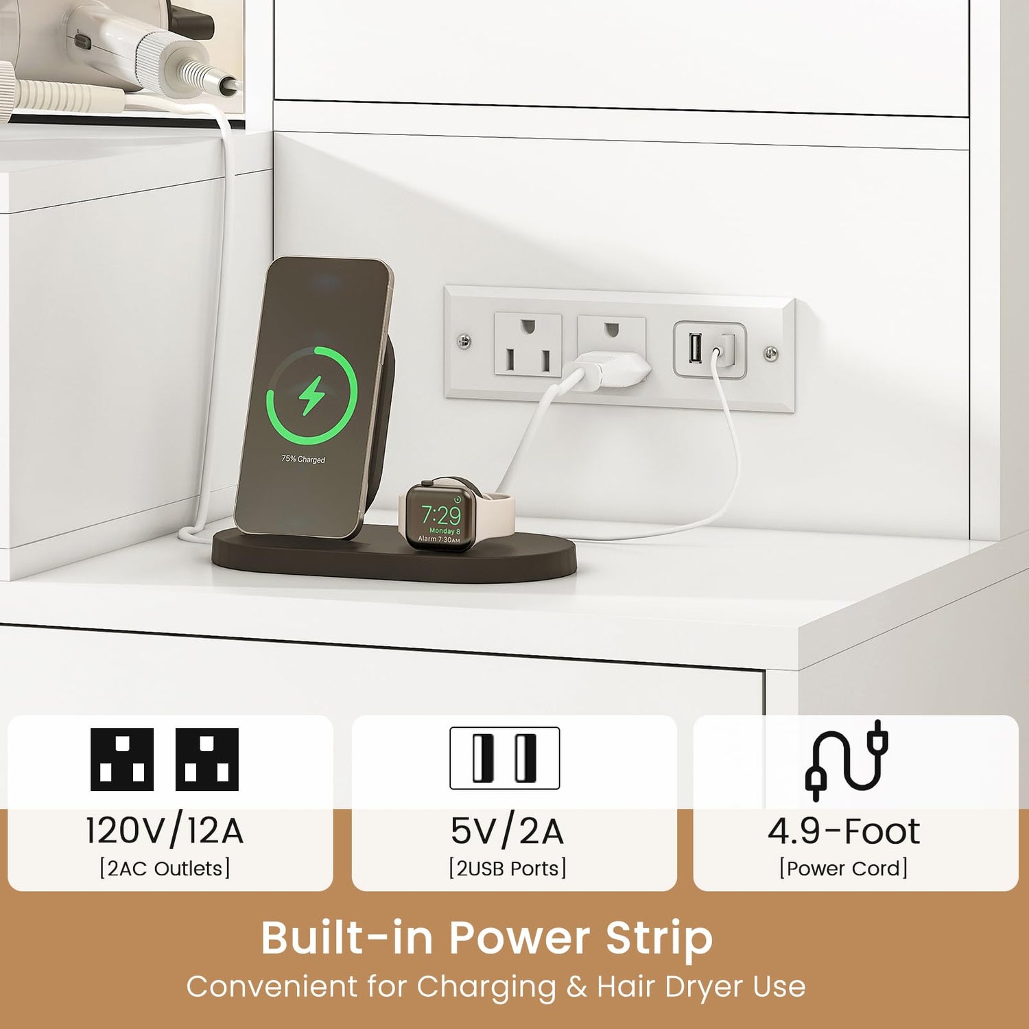 - Vanity Desk with Charging Station: Having the plugs in the front makes life so much easier! This vanity table add 2 standard plug sockets and 2 USB ports, more convenient for curling iron, beauty device, hair dryer and phone charging. Nice make up vanity for dressing room, salon or live broadcast