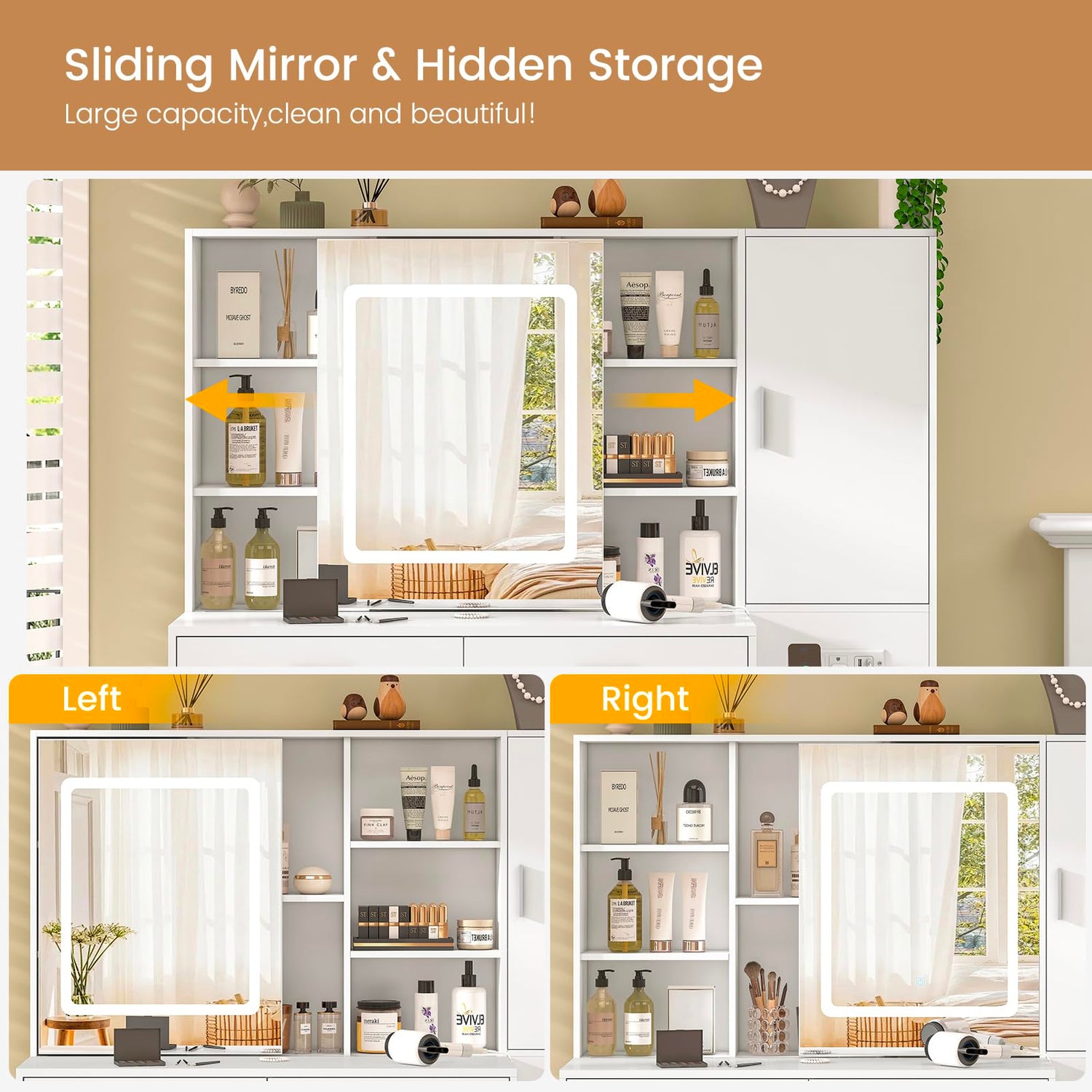 Quimoo 47" Vanity Desk with Sliding Lighted Mirror and Power Outlet, Makeup Vanity Desk with 5 Drawers and Cabinet, Hidden and Open Shelves, Vanity Table Set with 3 Color Lighting (White)
