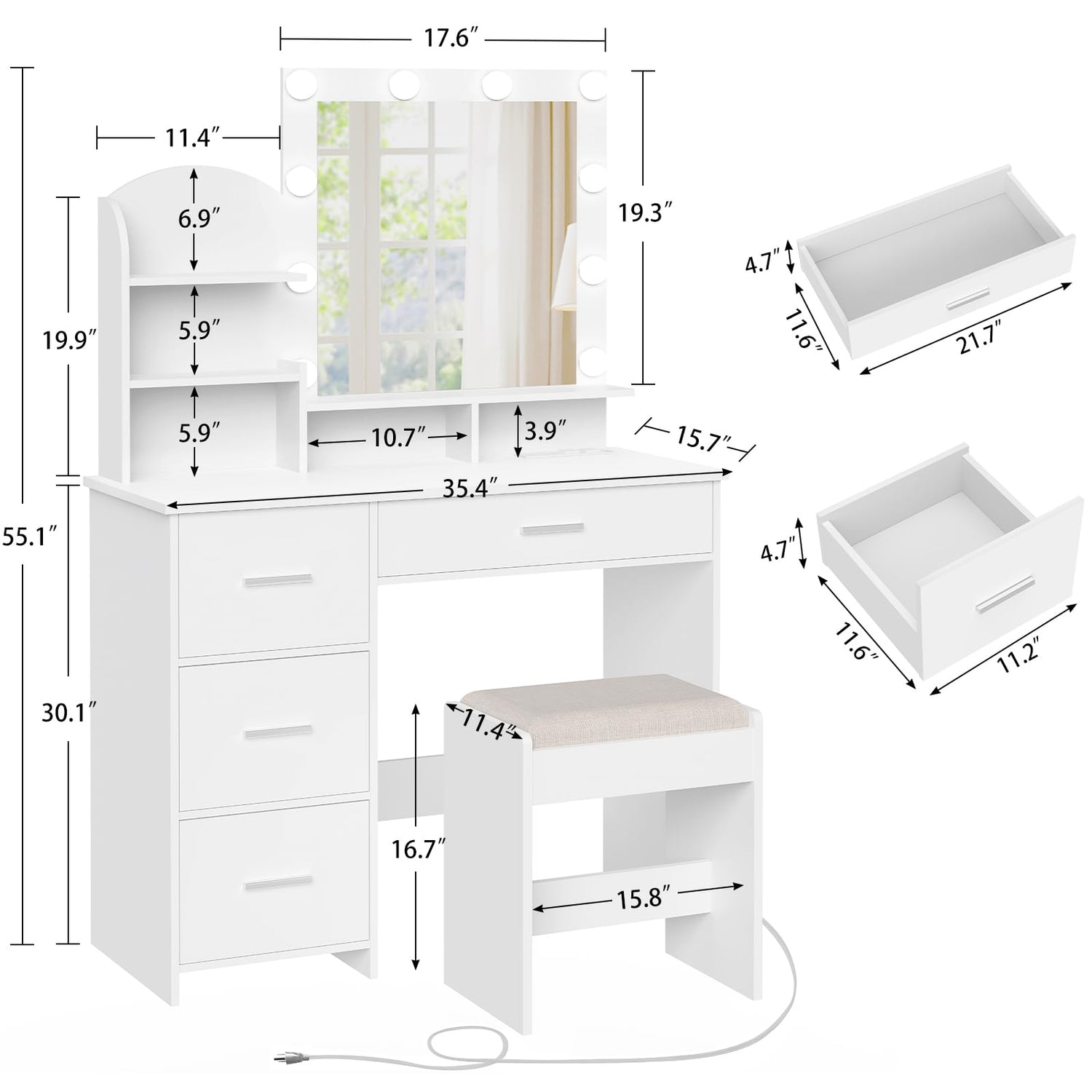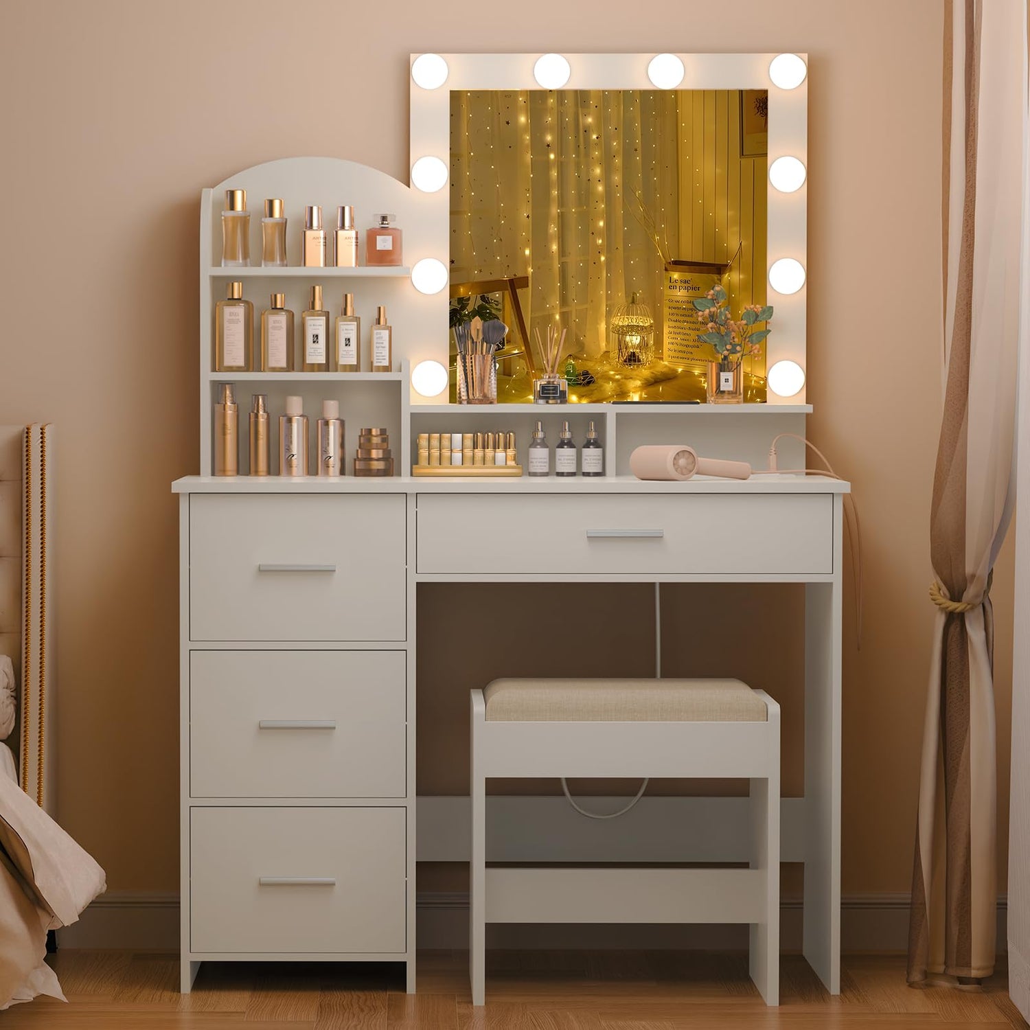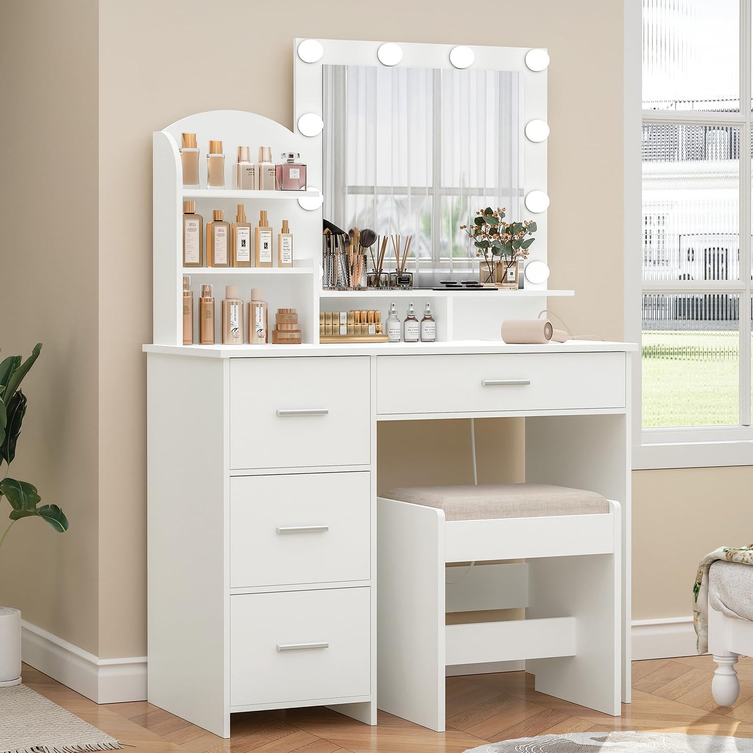 Quimoo Makeup Vanity with 10 Light Bulbs and Charging Station, Vanity Desk with Lighted Mirror & 4 Drawers Chest, Vanity Set, Vanity Table Set with Cushioned Stool, for Bedroom,White