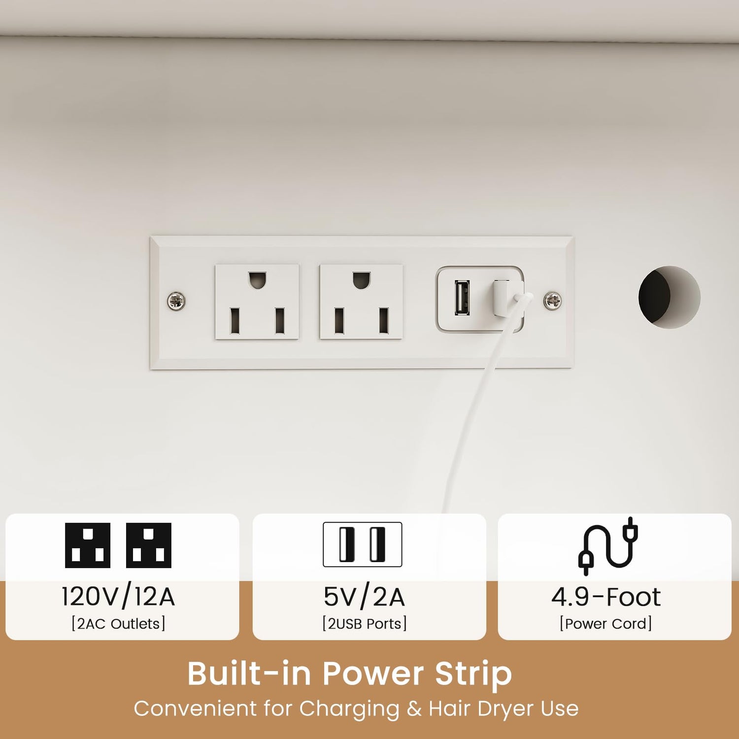 - Large Storage and Power Strip: Home for your jewelry, hair accessories and everything in your bedroom. Wider desk with 1 RGB cabinet, 1 visible long drawer and 2 drawers on 1 storage cabinet. This is the perfect amount of space for those who have quite a lot products. The power strip was built below the RGB cabinet. It's convenient to charge your phone and use hair dryer