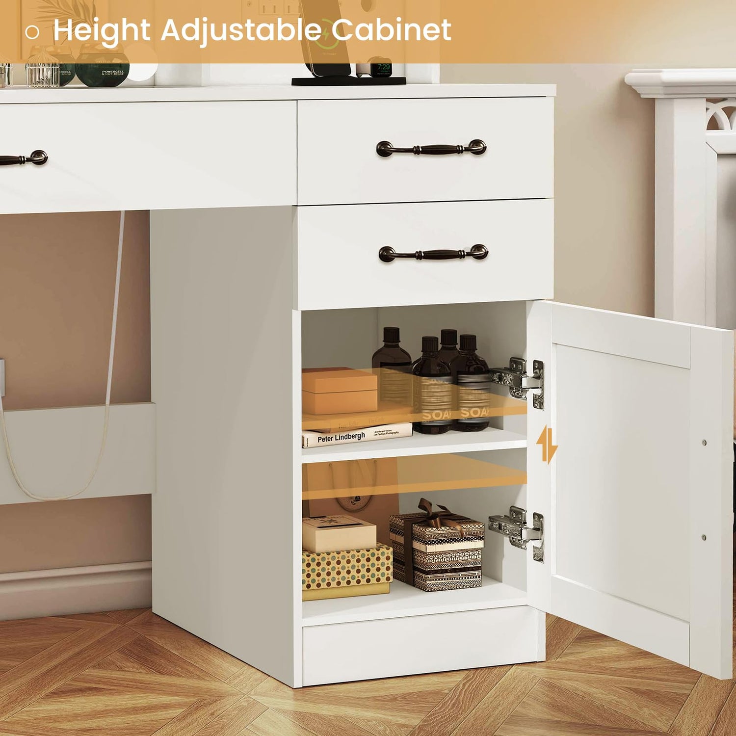 Quimoo Vanity Desk, Makeup Vanity with Lights, Large Mirror Vanity with 3 Drawers and 2 Cabinets, Vanity Table Set with Power Outlet and Glass Tabletop, for Bedroom (White)