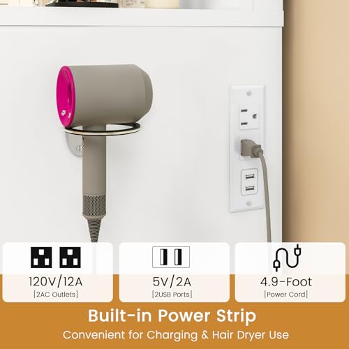 - Multifunctional Makeup Vanity: This vanity desk includes a charging station with 2 standard plug sockets and 2 USB ports and a hair dryer rack, help you charge your mobile devices and easy access to your hair dryer