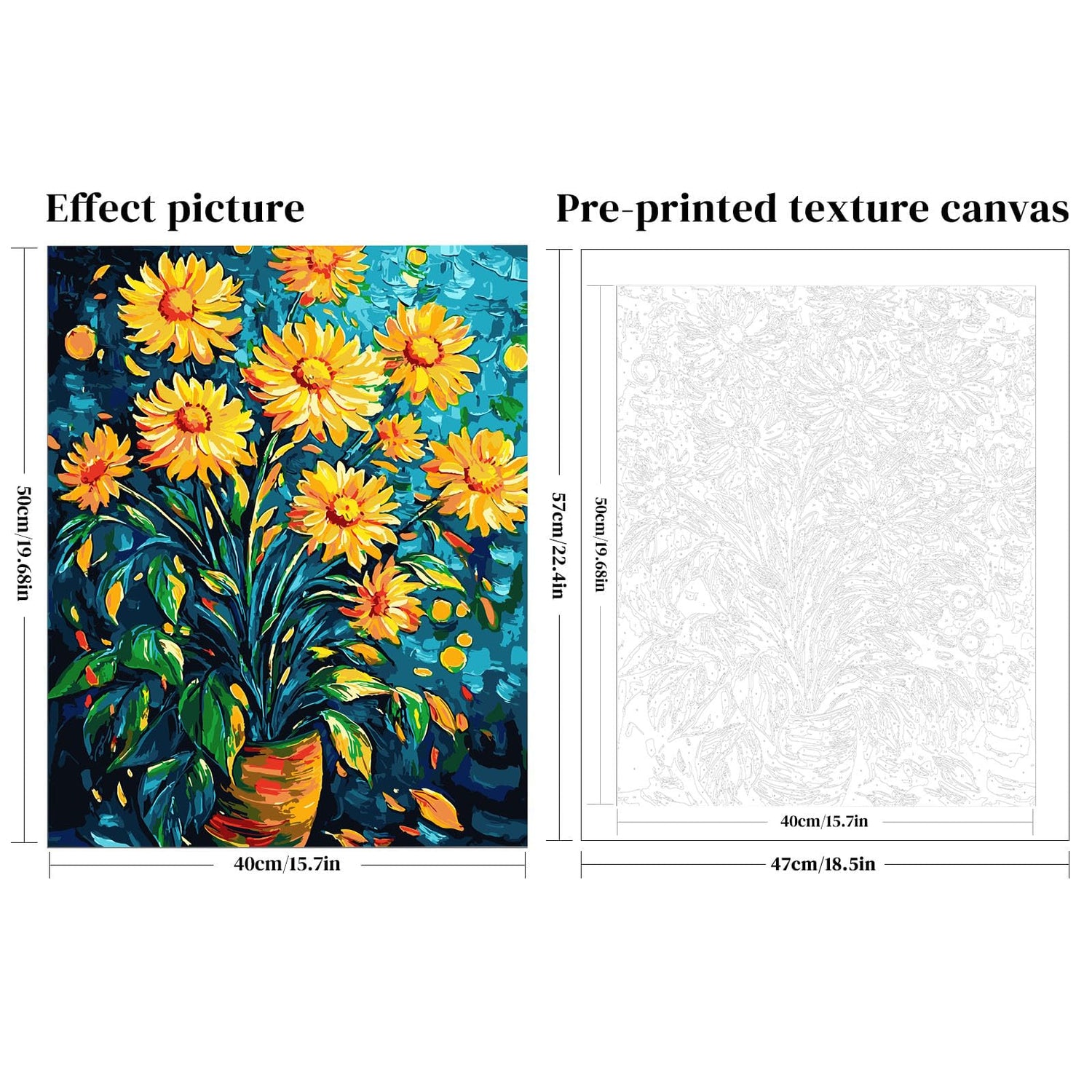 - đ»ăBeautiful Giftă:This sunflower painting by numbers can be used to decorate your living room or bedroom,kitchen,office,restaurant,bar,etc.making it full of vitality.The painting number kit will be a nice gift for birthday, Christmas,New Year's day,Thanksgiving day,Anniversary,etc,and it be a choice for adults to release the stress.