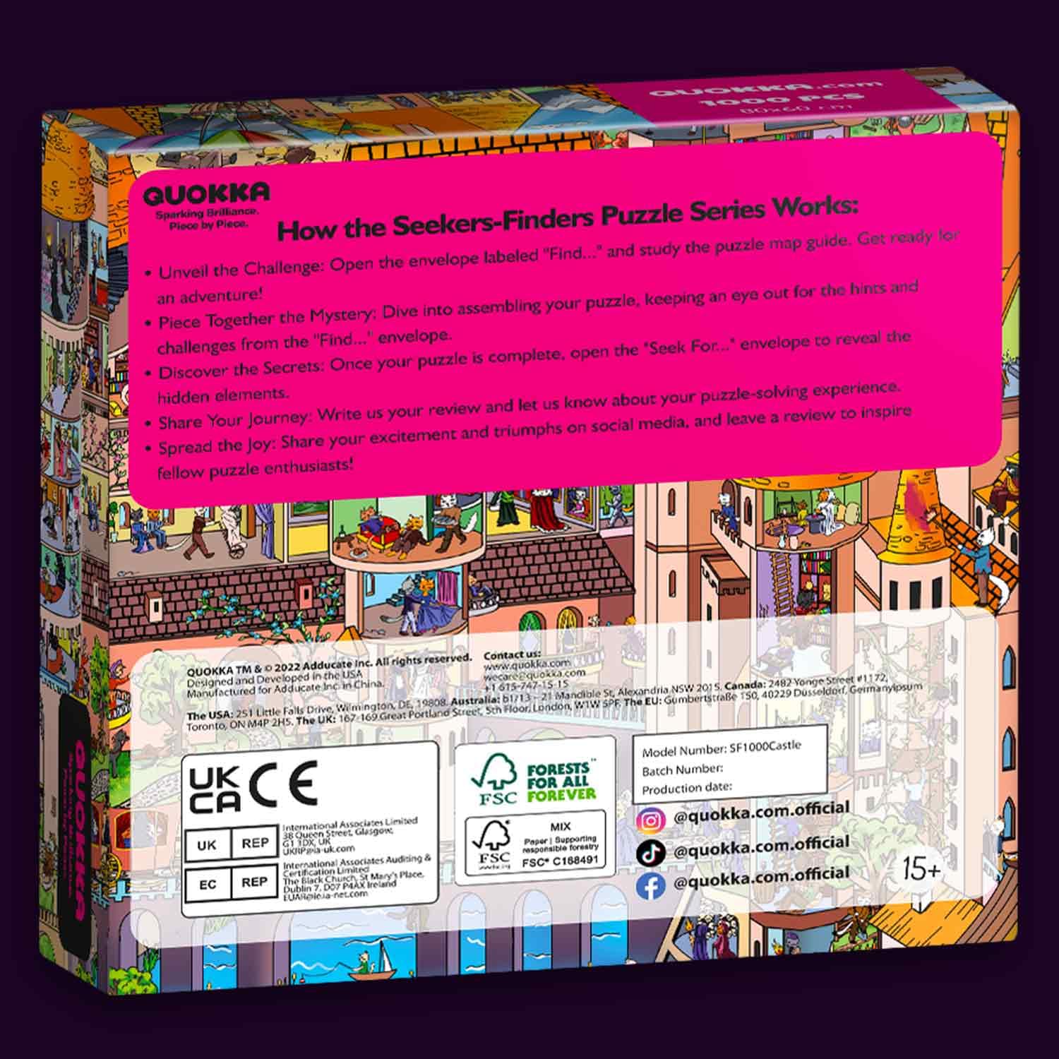 Details: Embark on an imaginative journey with the QUOKKA 1000 Piece Jigsaw Puzzle for Adults Nighty Cats. Featuring vibrant scenes of cats living as humans in a medieval kingdom, this puzzle is a masterpiece of intricate details, imaginative storytelling, and unique characters. Take your puzzling experience further with two surprise envelopes containing exciting extra tasks. Perfect for relaxation or gift-giving, this premium puzzle is sustainably crafted with FSC-certified materials and includes missing piece support for a stress-free experience. Ideal for family bonding or solo creativity, this puzzle guarantees hours of fun with a purpose!