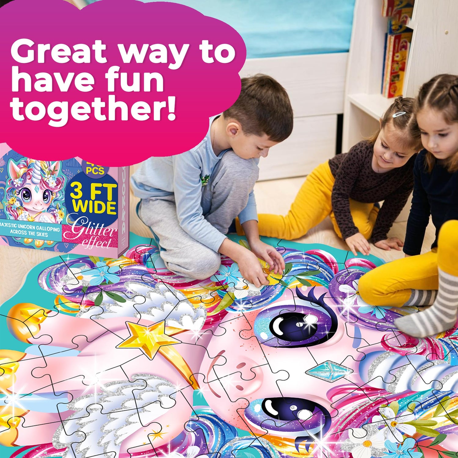 QUOKKA Glitter Floor Puzzles for Kids Ages 3-5 - 2x3 FT 48 Pcs Puzzles for Toddlers 2-4 - Shaped Large Giant Educational Toddler Puzzles Ages 24+ Months - Unicorn Toy Activity Game for Boys and Girls