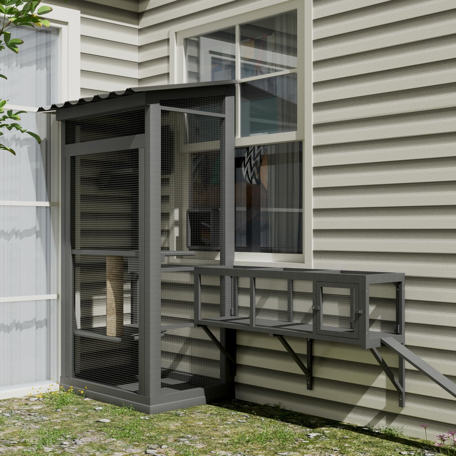 Details: Give your cats the freedom to enjoy the outdoors safely with this 2-in-1 cat patio enclosure outdoor tunnel and cat window box. Designed for maximum flexibility, it can function as a connecting tunnel to a catio or as a standalone indoor cat enclosure mounted outside your window. Made from weather-resistant New Zealand fir and treated with a durable waterproof finish, this structure is built to handle year-round outdoor conditions. With three open window-style doors, your feline friends can enjoy a full 360° view of nature, fresh air, and sunshine—all while staying protected. Whether used alone or as part of a larger outdoor cat shelter system, this modular design offers a safe, enriching outdoor experience for your pets.