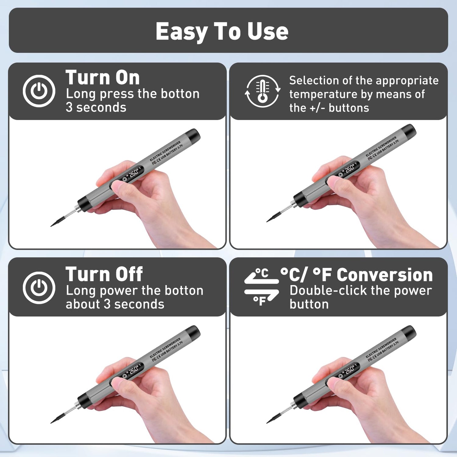 - Easy to Operate: Soldering iron kit just long press for 3 seconds to turn on/off. There is a layer of heat insulation on the surface to prevent the iron from burning your hands during operation.