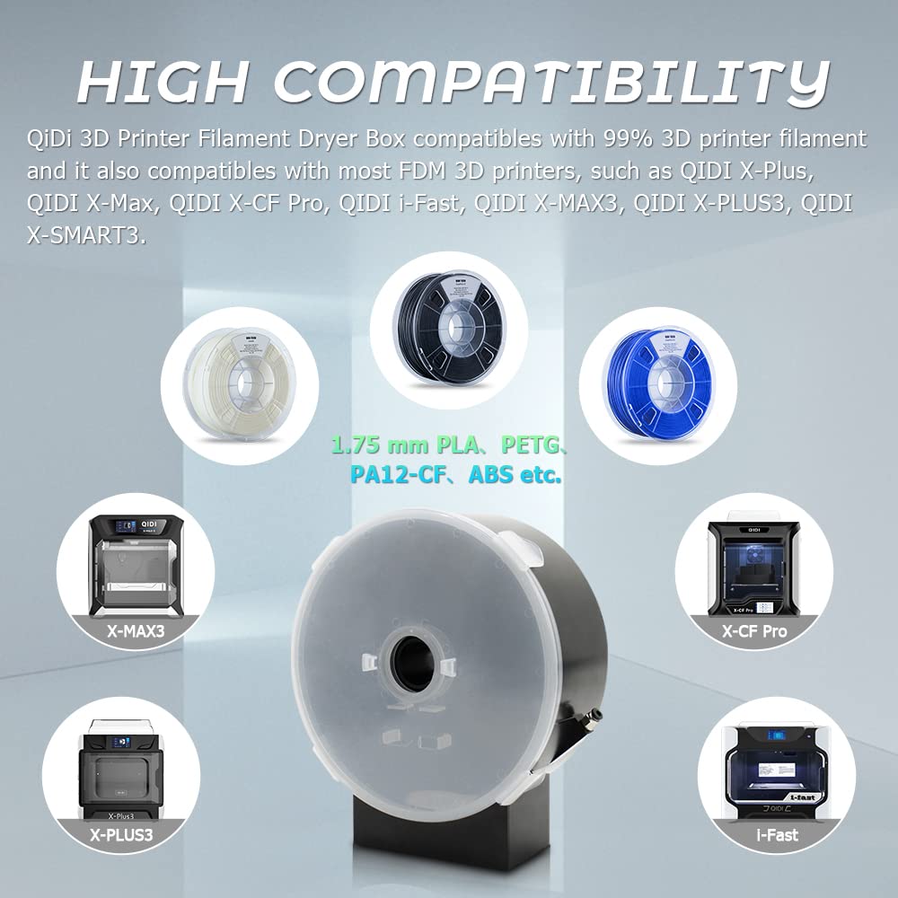 - 【Keep Filament Dry during 3D printing】Wet 3D printing filament will caused to stringing, clogging, poor adhesion, and Layer Shift. The QIDI TECH filament dryer box helps to dry excess moisture, improve your 3D model, and make the filaments say goodbye to the troubles of drawing, clogging, and poor adhesion.