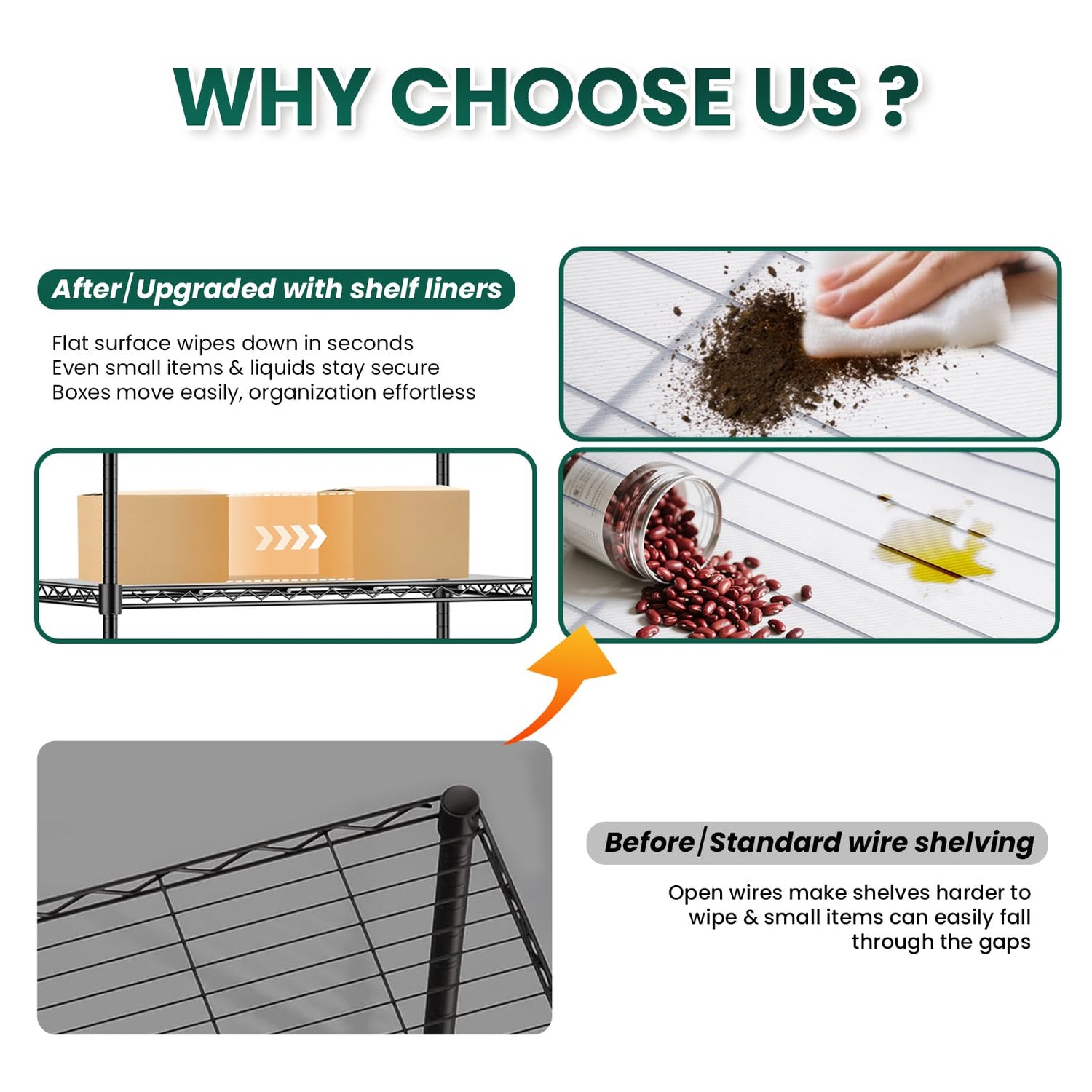 - 【Practical Shelf Liners Included】More than just a storage rack, this unit comes with 5 easy-to-clean shelf liners. They keep small items from falling through, stop boxes from getting stuck when sliding on or off, and let you place items directly on the shelf without worry. These liners help protect your wire shelves and make organization easier- an extra value you won’t get from most other wire shelving units