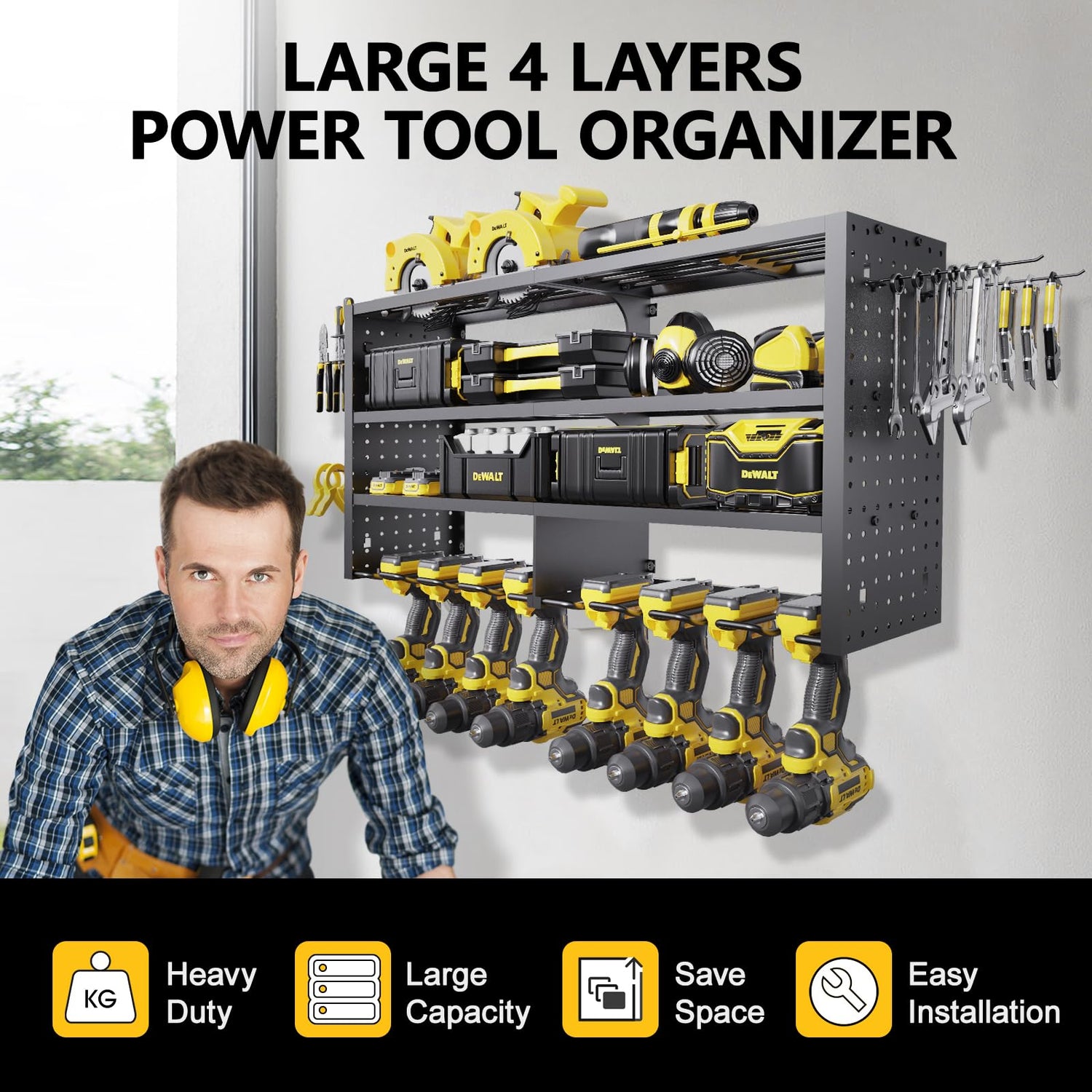 RacKeaLsi Large Power Tool Organizer Wall Mount, 4 Layer Garage Storage Cordless Tool Organizer with 8 Drills Holder, Heavy Duty Premium Metal Load 400 lbs, Ideal Garage Organization Gifts for Men