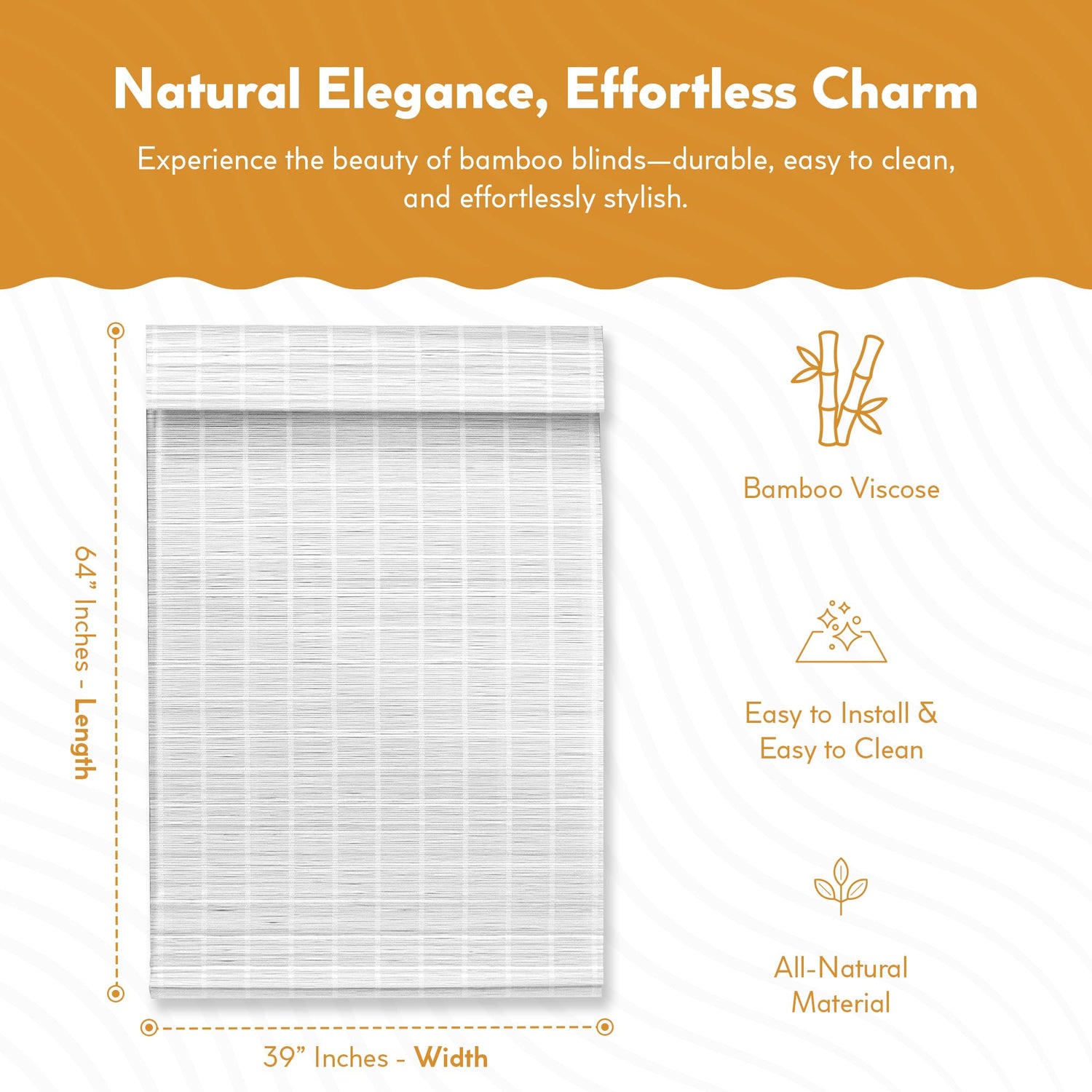 Details: Enhance your living space with Radiance Bamboo Blinds, an elegant solution for stylish and comfortable rooms and patios. Our 39"W x 64"L white bamboo Roman shades offer a serene ambiance by filtering harsh sunlight, creating a cool and inviting atmosphere. These shades effectively balance light control and aesthetic appeal, transforming any room into a more pleasant environment. Privacy is a key feature of our cordless blinds. They operate smoothly and effortlessly, eliminating the inconvenience and potential hazards of traditional cords. This design makes them particularly suitable for households with children or pets, ensuring both safety and ease of use. Crafted from high-quality bamboo viscose, these blinds demonstrate exceptional durability. They are designed to withstand various environmental conditions, making them suitable for both indoor and outdoor applications. Their versatile design complements a wide range of decor styles, from coastal themes to urban aesthetics. Installation is straightforward and user-friendly. The blinds are precisely sized to fit 39-inch windows, with an actual width of 38.5 inches for a perfect fit. This design ensures a seamless installation process without the need for professional assistance. Radiance Bamboo Blinds stand out for their optimal combination of style, functionality, and ease of use. They offer a contemporary alternative to traditional window coverings, elevating the appearance of any room. These versatile blinds are equally suitable for living rooms, bedrooms, or outdoor areas, providing a consistent and refined look throughout your home. The natural bamboo texture adds a tactile and visual element that enhances the overall decor. Upgrade your home with Radiance Bamboo Blinds for a sophisticated and practical window treatment solution. Please note that slight variations in color may occur due to differences in screen calibration.
