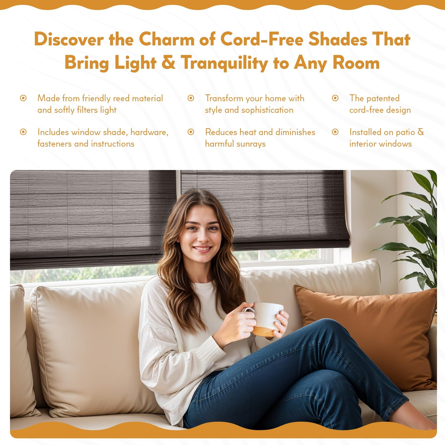 Details: Relax the look of any room with the Calm and comforting cordless Espresso and driftwood flat weave roman shades. , private, textured natural shades (also called 100Percent bamboo blinds, bamboo viscose shades, or woven woods) stylishly reduce bright light and protect your furniture from fading. The rich wood tomes of natural shades are complimentary to trending rugs as well as many hardwood floors and furniture finished. Natural shades are textured window blinds that are available in many different colors and styles. They are popular window treatments for coastal and beach properties, lakeside or country cottages, and traditional or Metropolitan homes. These new roman shades have no cords, so they are completely safe and pose no risk to small children, a safe and stylish way to decorate your home! certified as best for kids, a window covering program created by an independent lab that includes only cordless shades that are safe for kids. Natural color brings warm tones to your space inside/outside window Mount5" valance available in 64" drops privacy includes mounting hardware: left and right brackets, wall anchors, and installation screws easy to use cordless operation pull down on the bottom rail (in the center) to lower the shade push up on the bottom rail (in the center) to raise the shade tension spring keep the shade locked in place when no pressure is applied tension spring is adjusted to each size of shade, heavier shades require more tension