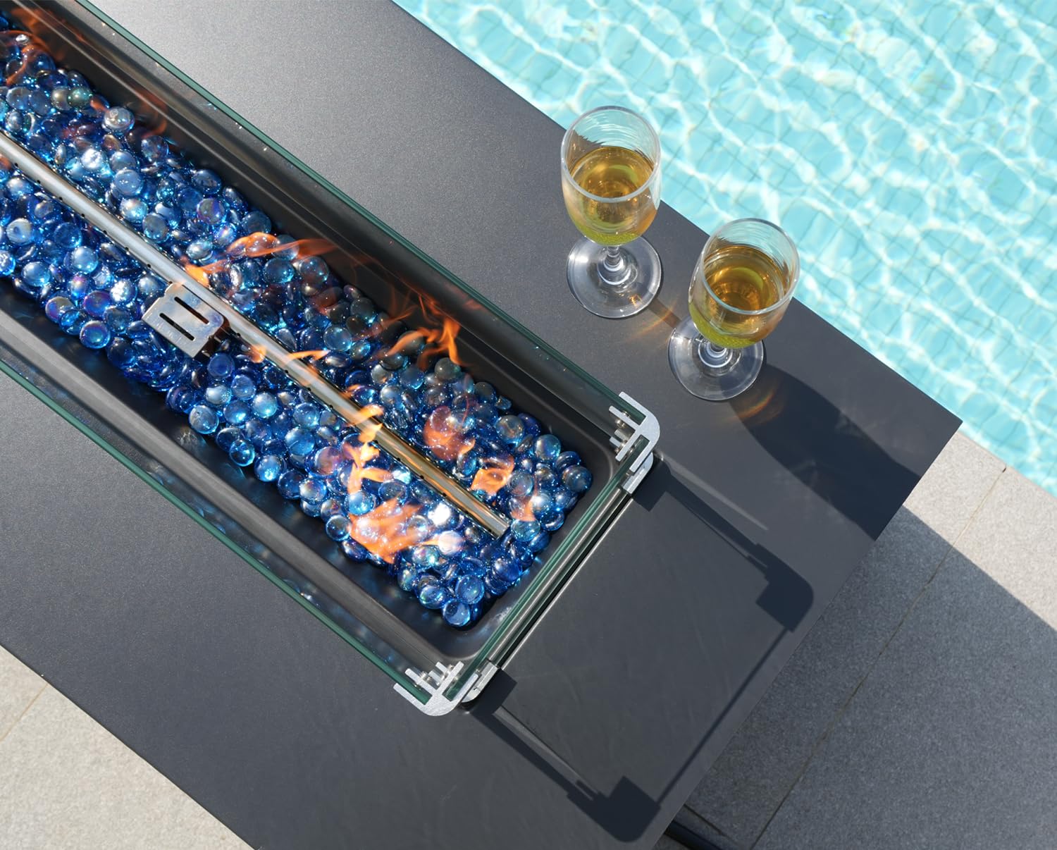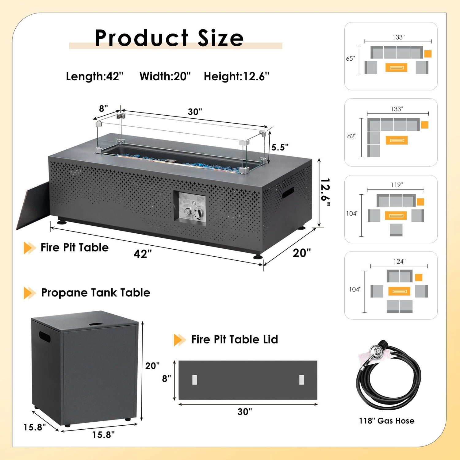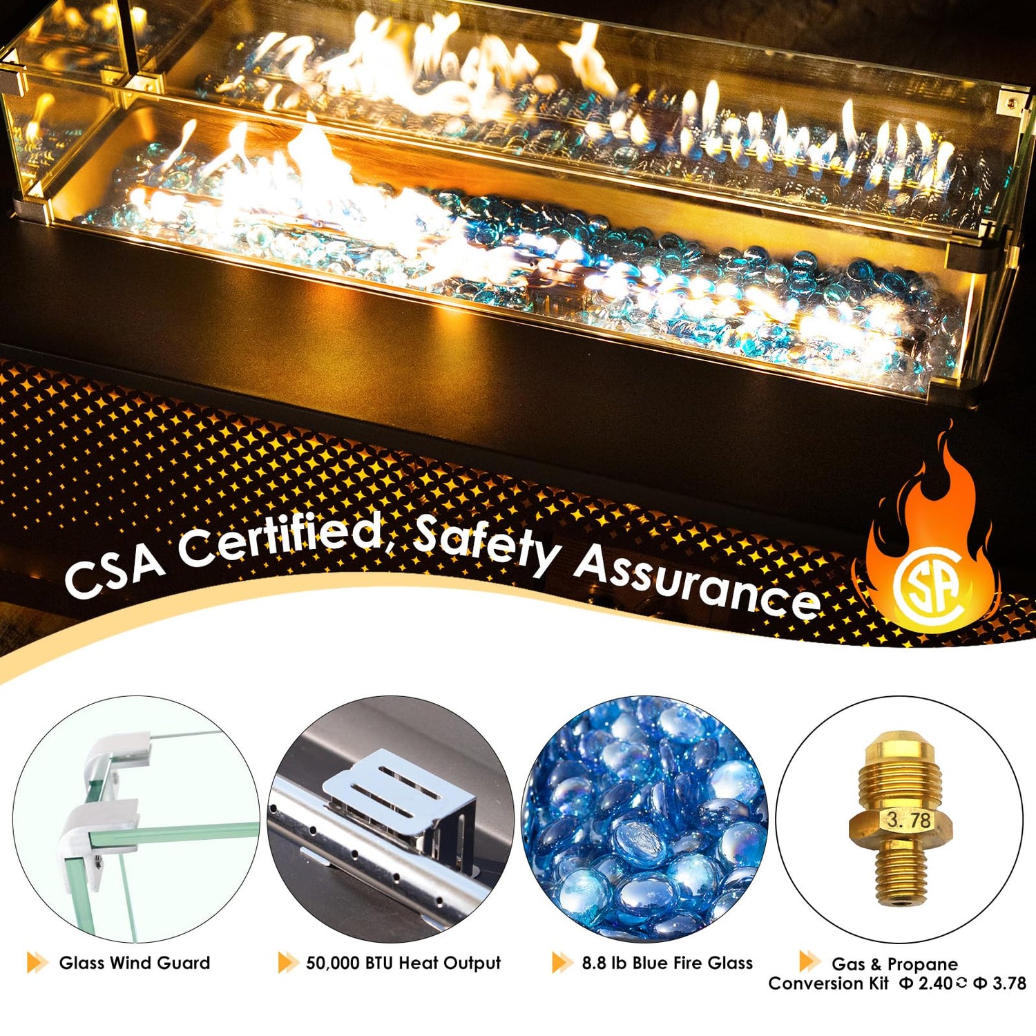 - Complete Setup with Premium Accessories: Includes everything you need for a full outdoor experience: fire pit table (fully assembled), matching propane tank table, glass wind guard (with recessed groove for stability), 8.8 lbs blue fire glass, waterproof cover, dual-fuel valve for propane or natural gas, adjustable leveling feet for stable placement on uneven surfaces