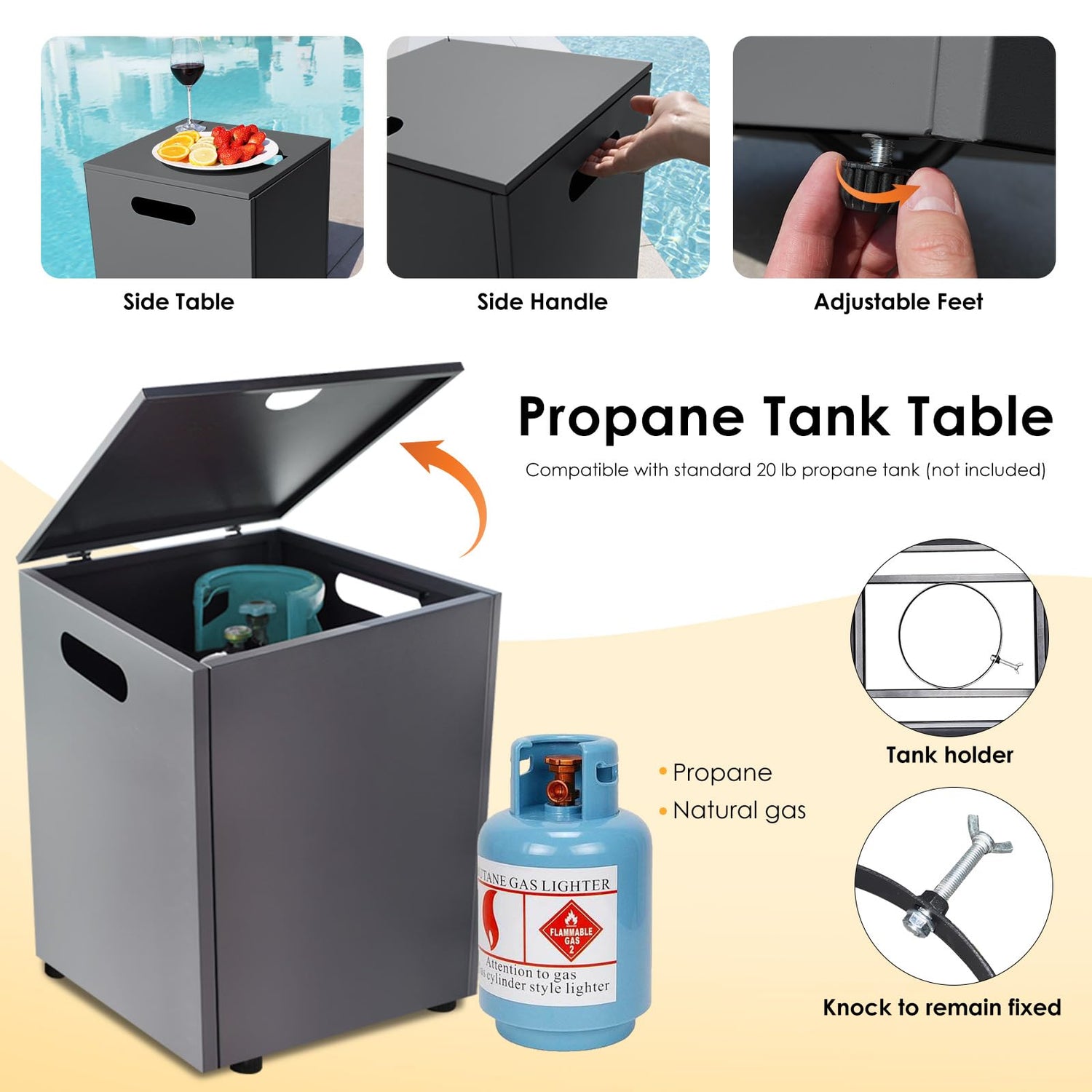 - Seamless Build, No Assembly Needed: The main fire pit arrives fully assembled—just unbox and enjoy. Its seamless, one-piece structure blends clean modern lines with long-term durability and stability; The coordinating propane tank table is easy to set up and includes a hidden hose path for a clutter-free look