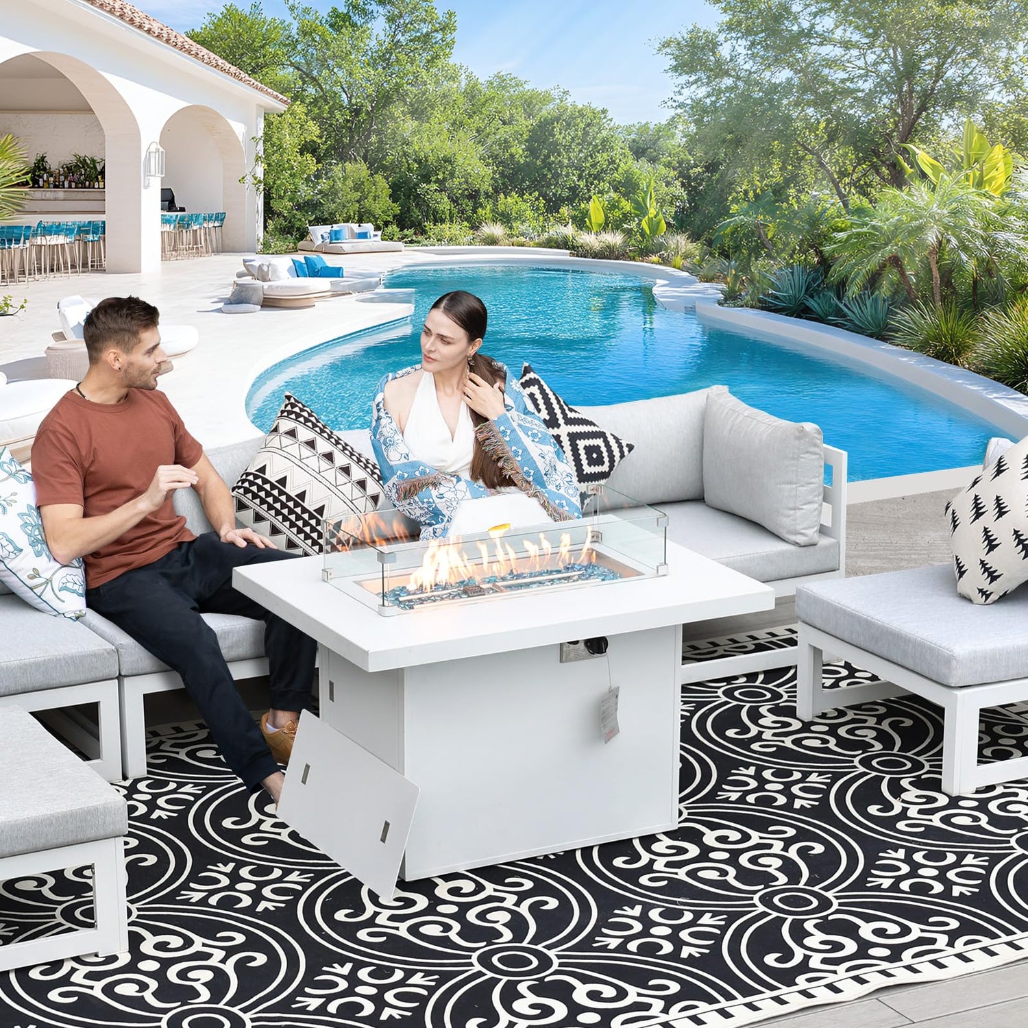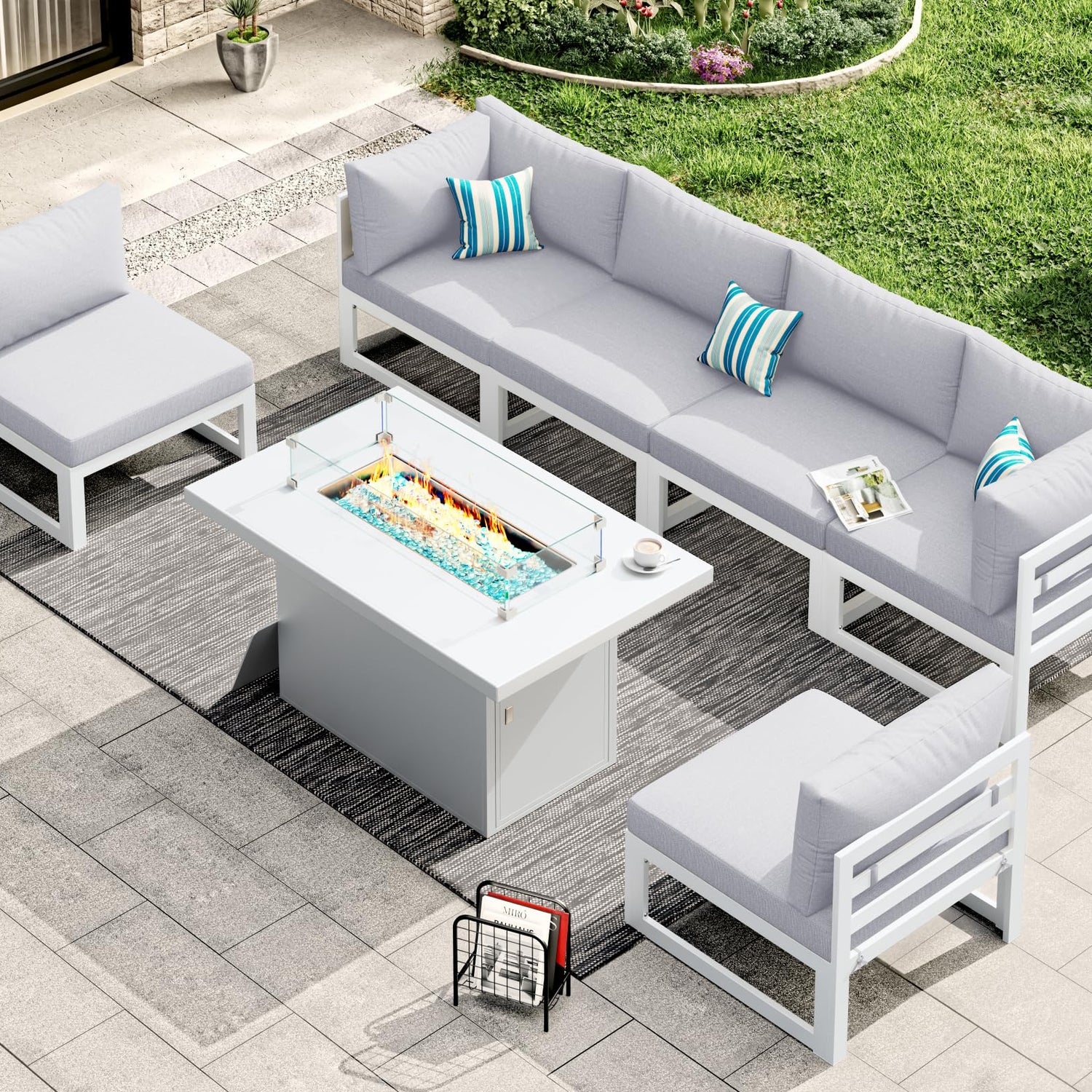 - Set Includes: This modern 7-piece aluminum outdoor furniture set features a firepit table, four armless chairs, and two corner chairs; In addition, we also put one pc of table cover, one set wind guard, and 18 lbs glass beads in the fire table box; These modular pieces can be organized at your preference
