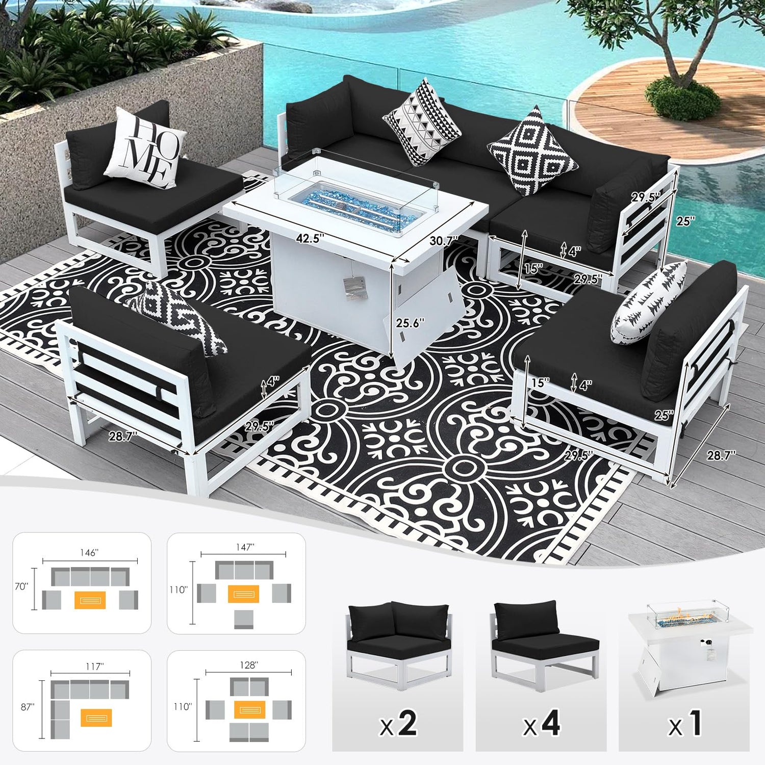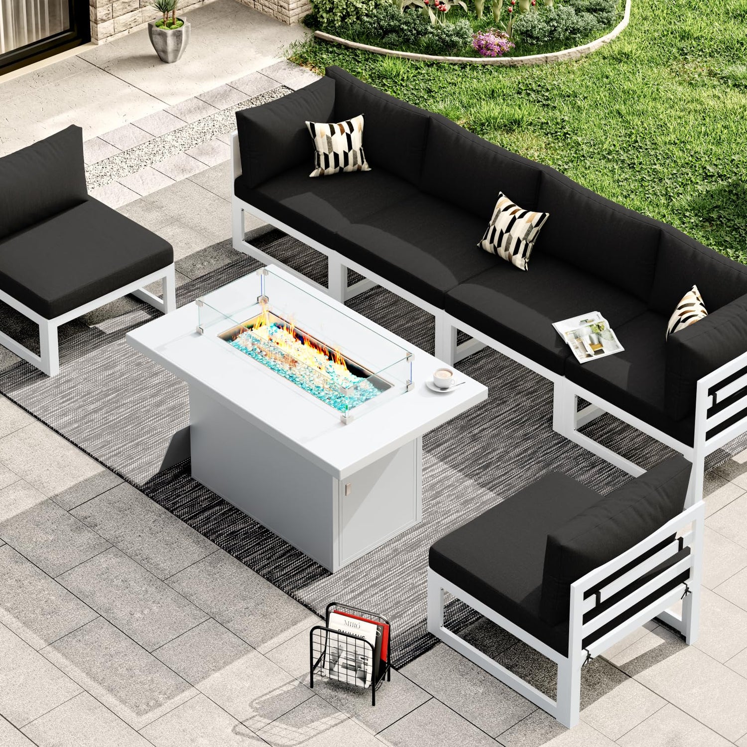 - Set Includes: This modern 7-piece aluminum outdoor furniture set features a firepit table, four armless chairs, and two corner chairs; In addition, we also put one pc of table cover, one set wind guard, and 18 lbs glass beads in the fire table box; These modular pieces can be organized at your preference