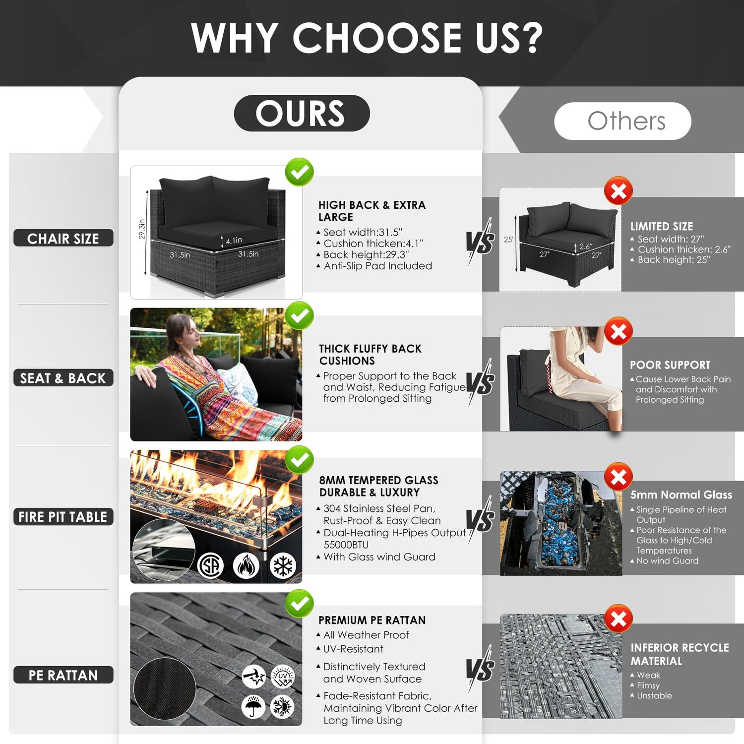 RADIATA 9 Piece Wicker Patio Furniture Set with Fire Pit, All-Weather Outdoor Sectional Couch High Back Large Size, Modular Backyard Seating Sofa Set with Propane/Natural Gas Firepit Table, Grey&Black
