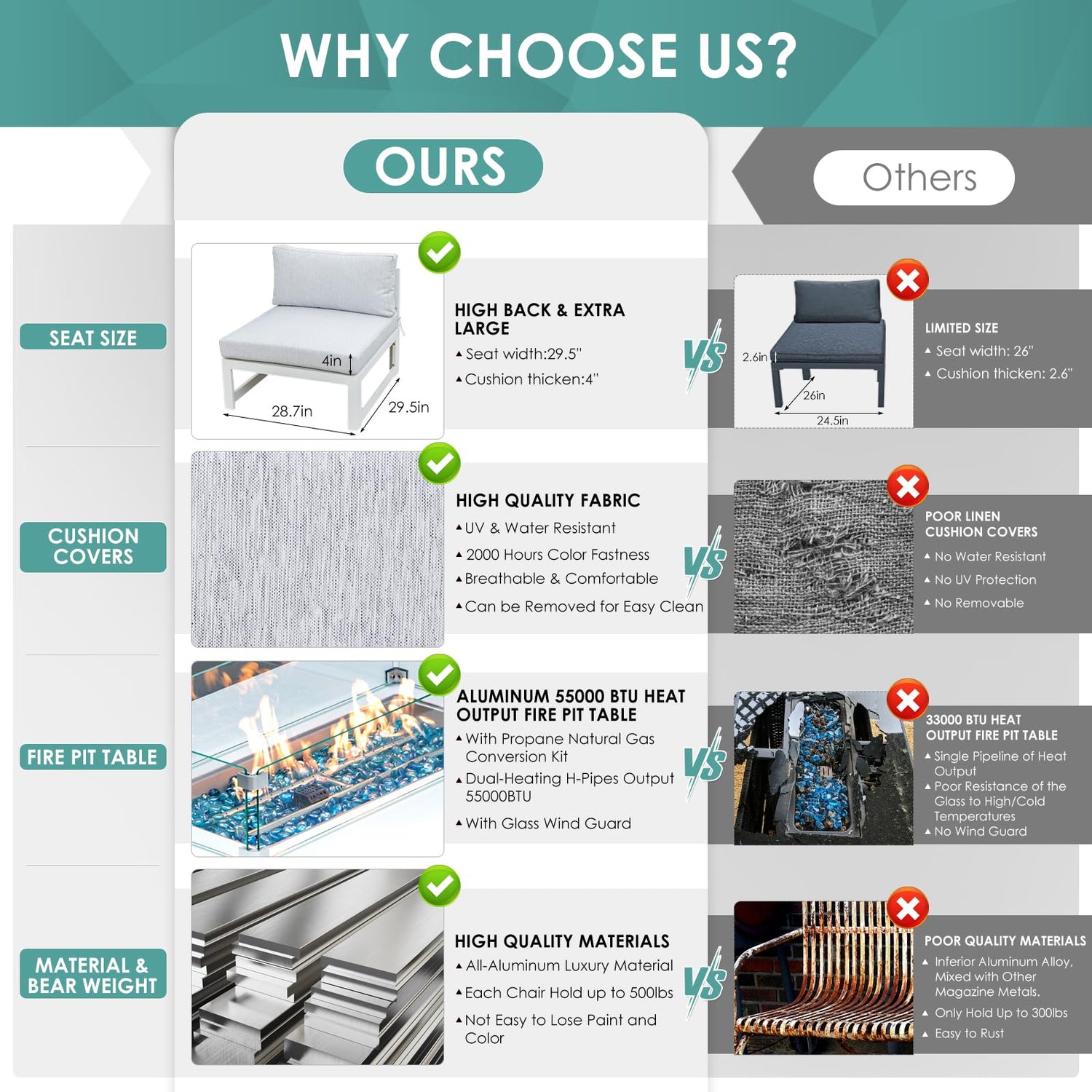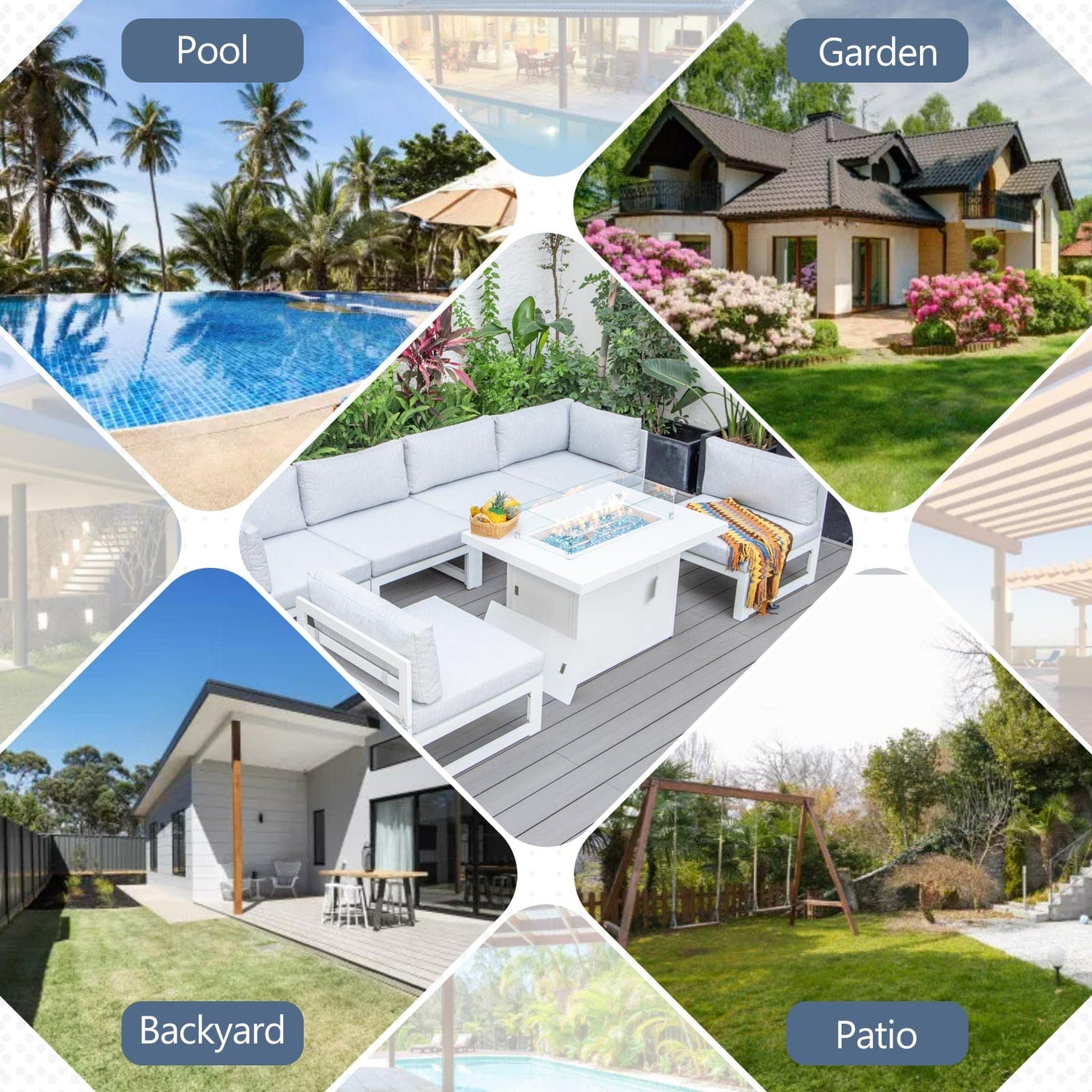 - Set Includes: This modern luxury 9-piece conversation set features a fire pit table, two armless chairs, four corner chair, one chaise lounge, and one side table; Additionally, the fire pit table box includes a table cover,one set wind guard, and 18 lbs of fire glass; These modular pieces can be arranged according to your preference