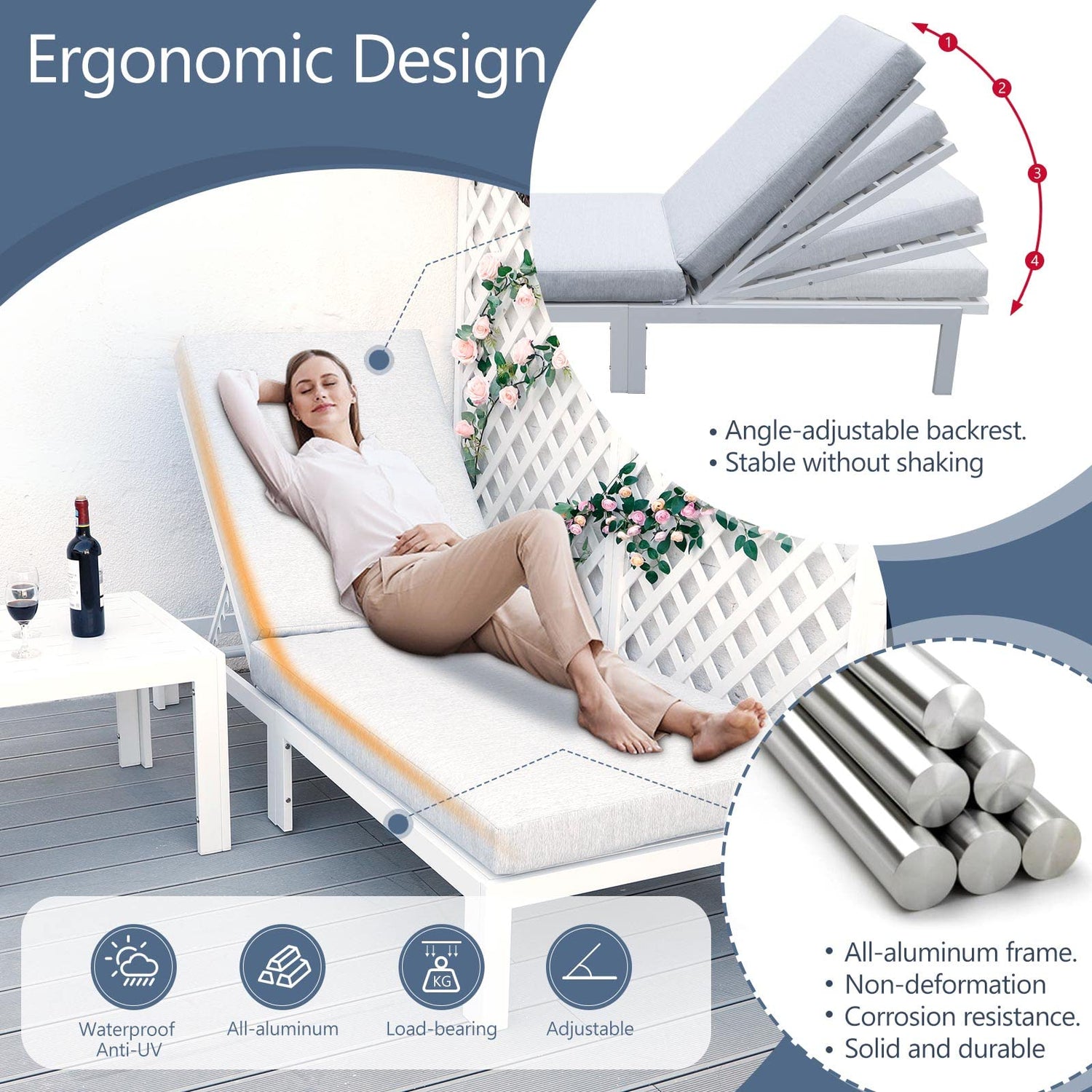 - Extra-Large Chaise: Measuring 78.7" × 29.5" with a 4" thick cushion, this chaise lounge offers spacious comfort for relaxing; The durable all-aluminum frame provides stable, even support, while the powder-coated, rust-resistant finish ensures long-lasting performance, even poolside; The 6-position adjustable backrest reclines from 14.9" to 39.3", allowing you to sit upright or lie flat for sunbathing and leisure