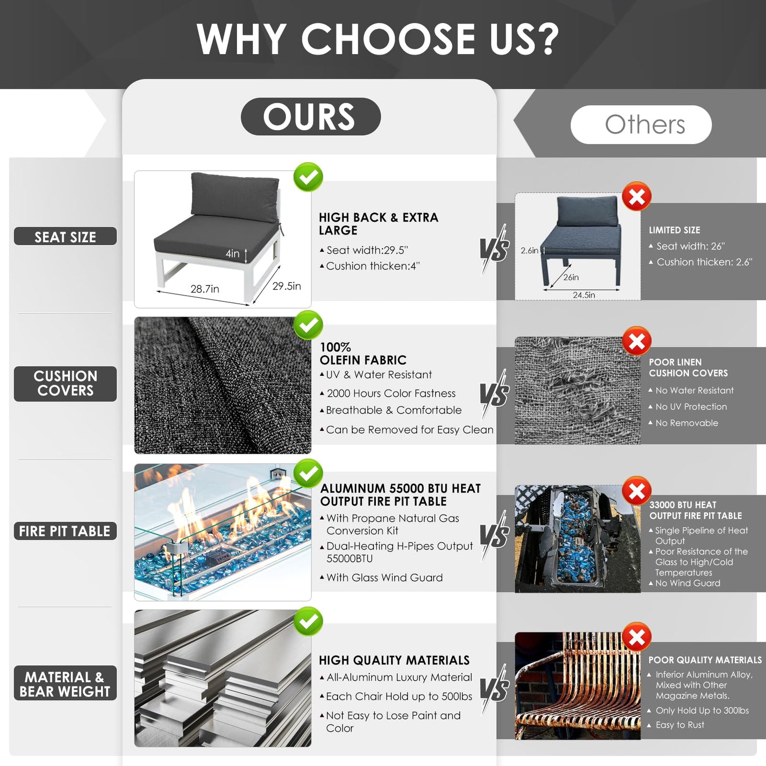 RADIATA 9 Pieces Aluminum Patio Furniture with Fire Pit Conversation Set with 29'' Large Depth Seat Outdoor Luxury Sofa Set (Dark Gray with White Aluminum)
