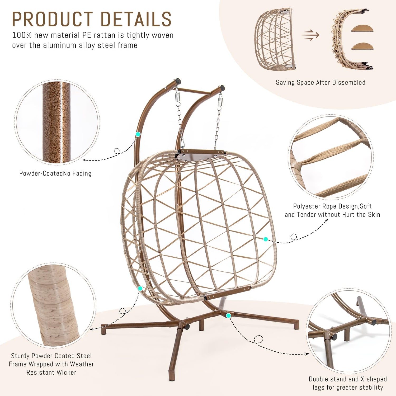 - Hand-Woven Pe Rattan, Easy to Clean: Crafted from durable, weather-resistant PE rattan, this egg shaped hanging chair 2 person withstands sun and rain; The tight wicker weave prevents sagging, while the surface is easy to wipe clean with a damp cloth for hassle-free maintenance